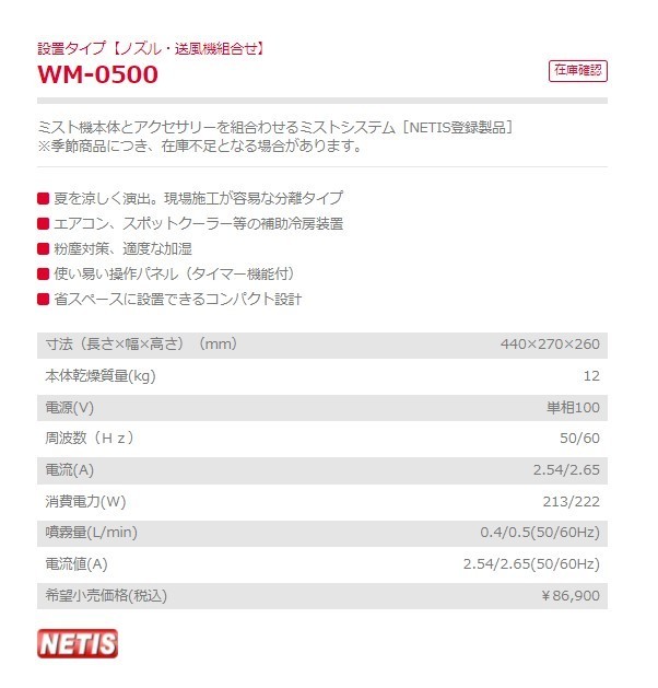 【商品詳細】 【新ダイワ 設置タイプ【ノズル・送風機組合せ】WM-0500】 ミスト機本体とアクセサリーを組合わせるミストシステム[NETIS登録製品] ※季節商品につき、在庫不足となる場合があります。 夏を涼しく演出。現場施工が容易な分離タイプ エアコン、スポットクーラー等の補助冷房装置 粉塵対策、適度な加湿 使い易い操作パネル(タイマー機能付) 省スペースに設置できるコンパクト設計 寸法(長さ×幅×高さ)(mm):440×270×260 本体乾燥質量(kg):12 電源(V):単相100 周波数(Hz):50/60 電流(A):2.54/2.65 消費電力(W):213/222 噴霧量(L/min):0.4/0.5(50/60Hz) 電流値(A):2.54/2.65(50/60Hz) ■季節商品となり、在庫がなくなる場合がございますので早めのご準備をお勧めします! メーカーホームページはこちらからやまびこ産業 ※仕様は予告なく変更になることがございます。 ※下記注意事項の確認をお願いいたします。