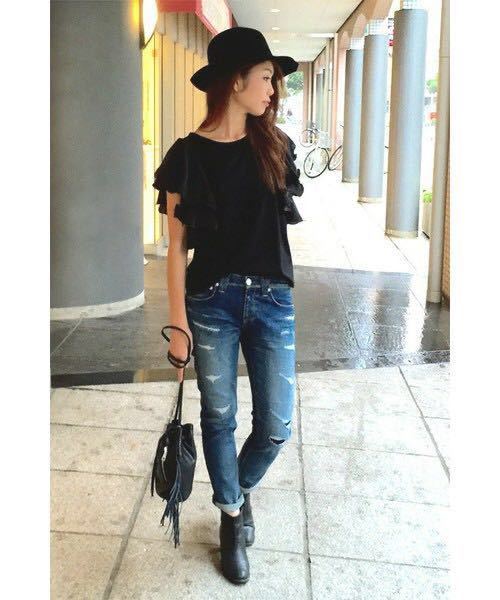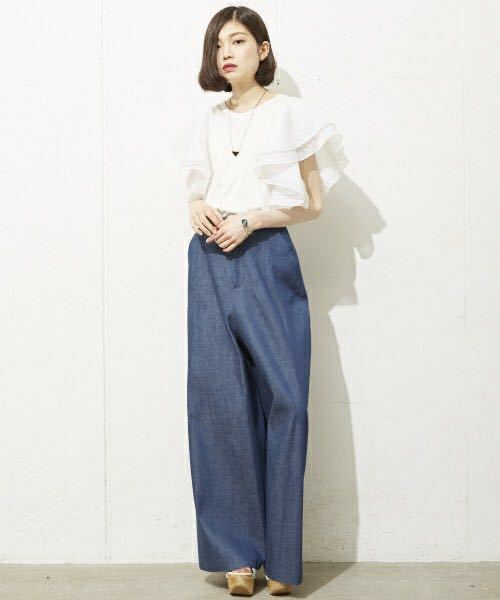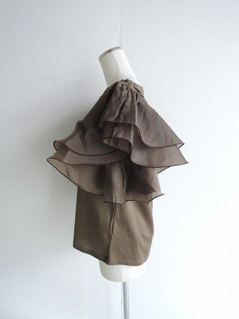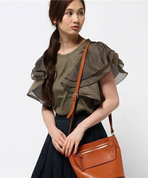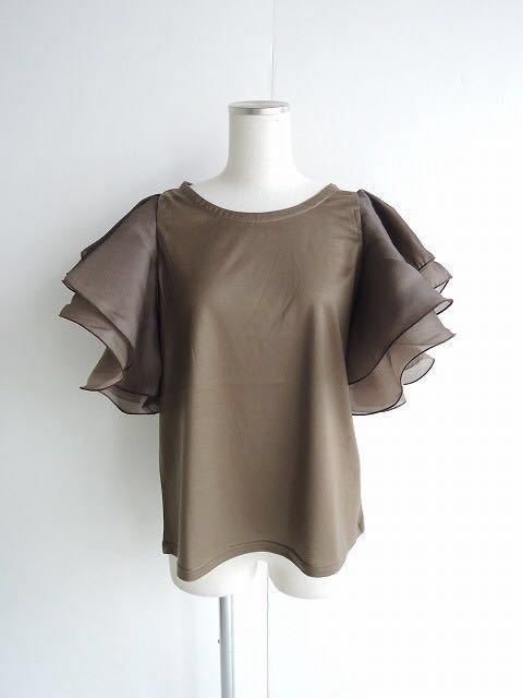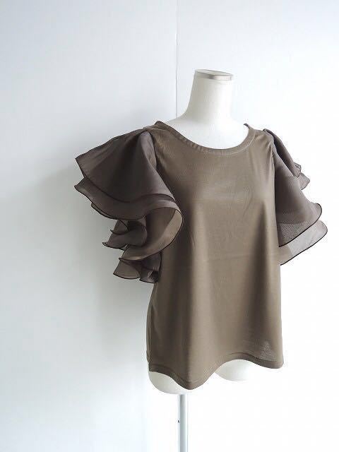 ゆるやかなフレアを描くフリル袖が目を惹くTシャツ。シアー素材を重ねて繊細にボリュームを出しています。二の腕もカバー。