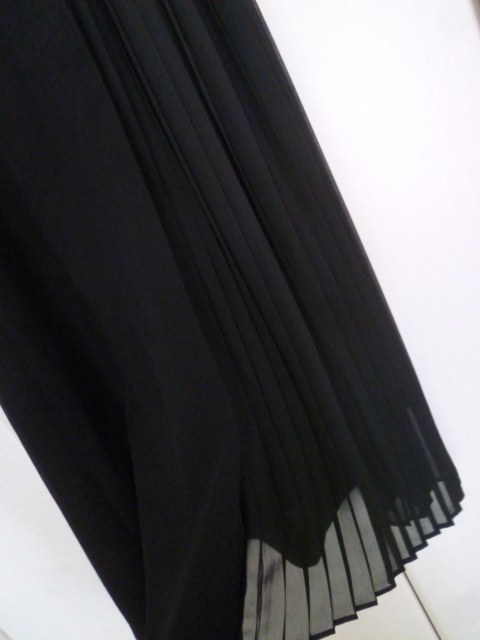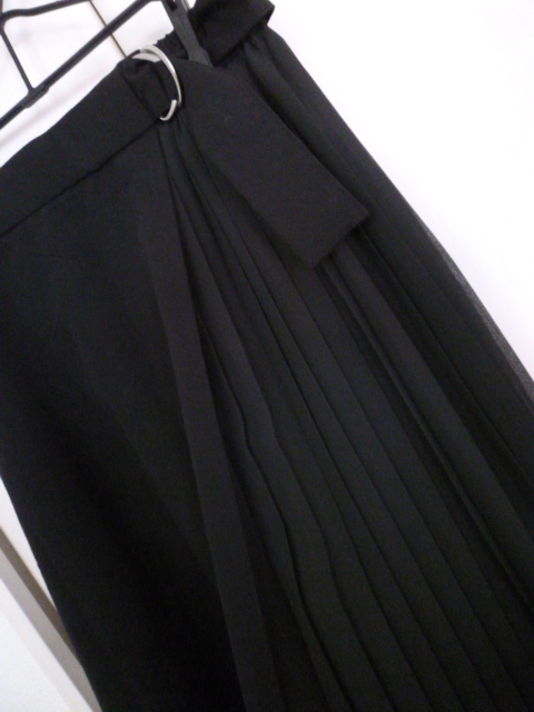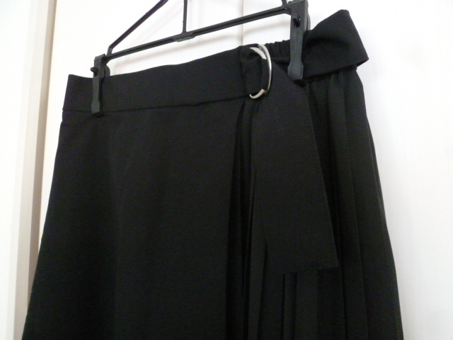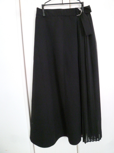 GU/ジーユー△黒サイドシフォンプリーツ異素材フェイクベルト付き巻きスカートラップスカートロングスカート/ブラック△SK713