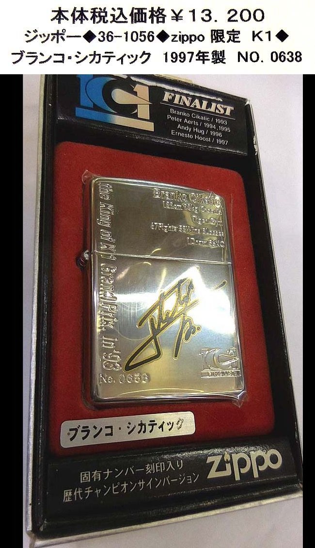 現物写真撮影、この写真の品が届きます。ZIPPO:スポーツ・K1 シリーズ。シルバーサテーナベースに、K1のスター「ブランコ・シカティック」です。限定品シリアルN0.0638廃版になっており今後入手困難品です。1997年製 H XIII インサイド同年同月です!!ビンゴが出品している全ての商品は、店頭販売、他オークション販売、ショッピング販売等重複し販売しております。時間差で売れ切れや、出荷点検検等で傷が付いていたり破損している事もあります。従いまして、お買い上げ頂きましても出荷出来ない場合も有りますので、予めご了承の上お買い求め下さい。ご注文商品は他商品と同梱配送出来ますので、何個ご注文されても送料は1口分です。1.レターパック発送 ¥600日時指定不可。(郵便レターパック)。2.宅配便発送税込み ¥880日時指定必須(沖縄/離島は別途価格)。必ず 受取日時 をご指定下さい。(例:15日 18~20 時必着)再配達防止の為。 (業者は当社にお任せ)。3.代金引換発送引手数料税込み ¥1、210 日時指定必須(沖縄/離島は別途価格)。 必ず 受取日時 をご指定下さい。(例:15日 18~20 時必着)再配達防止の為。(業者は当社にお任せ)。