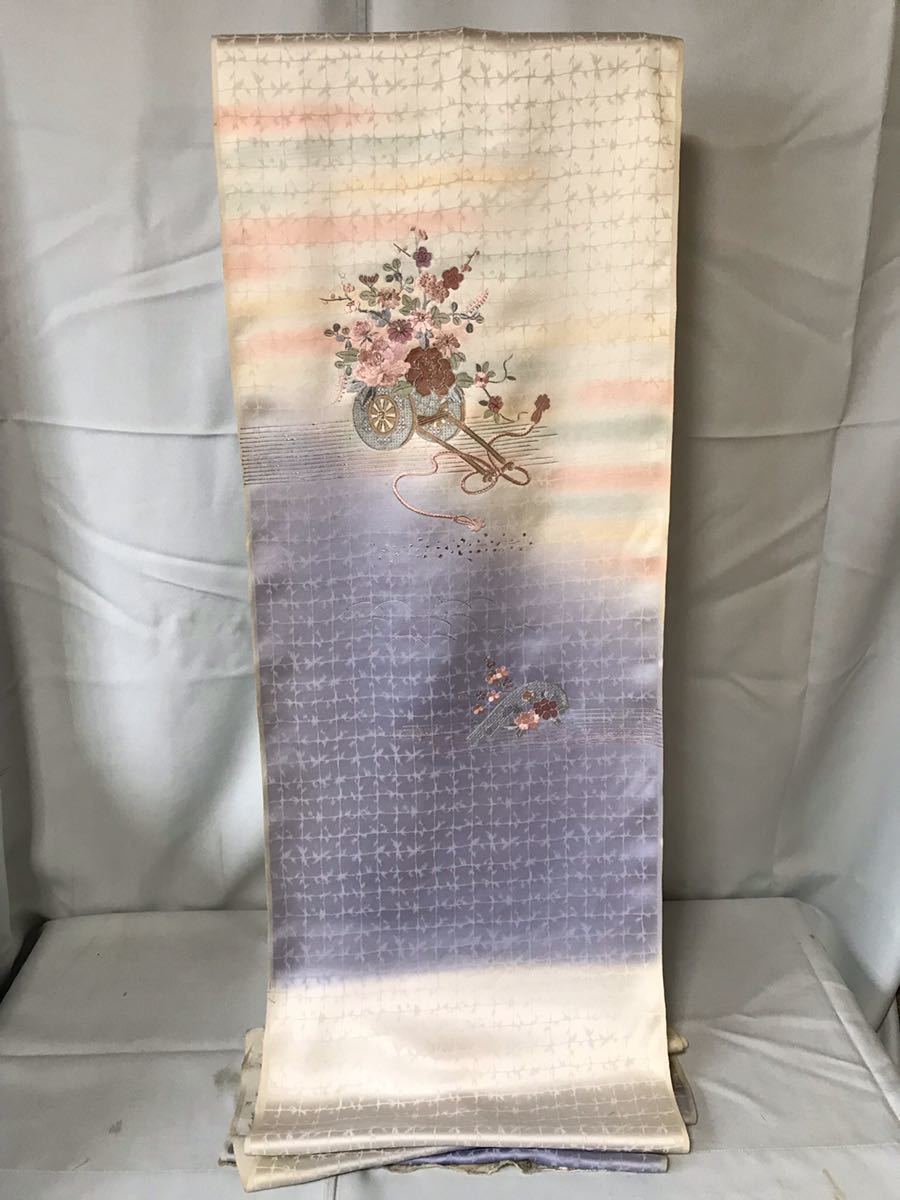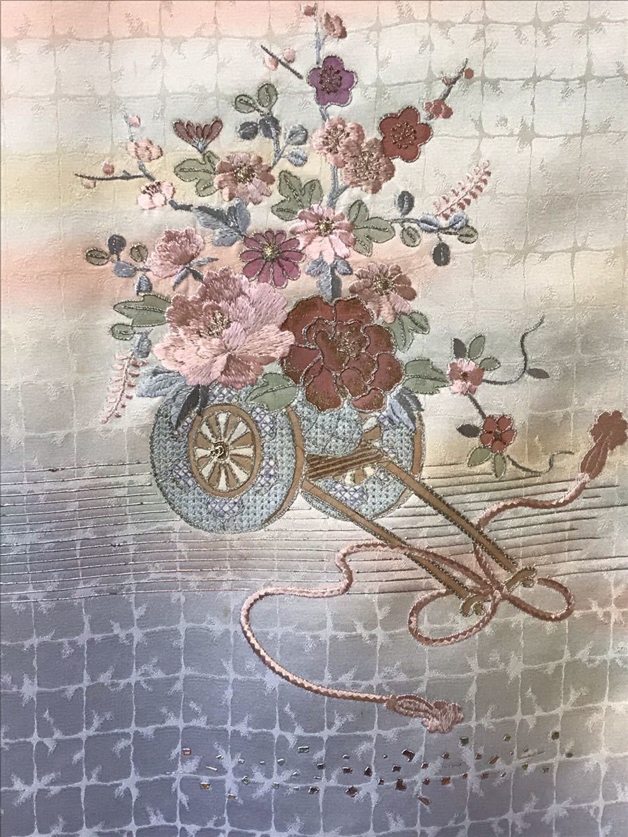 <正絹 ><つけさげ訪問着 ><丹後ちりめん><未仕立て ><汕頭刺繍の花くるまの柄><裾ぼかし染め><みゆき・高級別織生地>