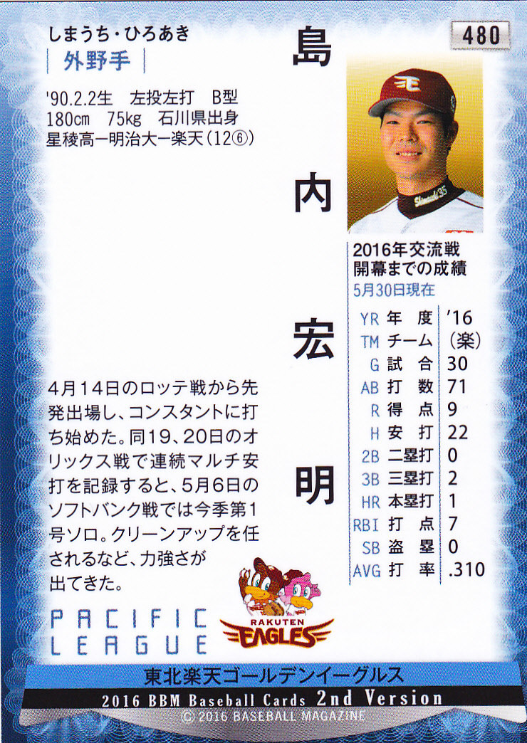 BBM2016ベースボールカード2nd 480 島内宏明 石川県 星稜高校 明治大学 東北楽天ゴールデンイーグルス