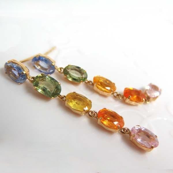 カラフルなニュアンスカラーの5色の天然サファイアをつないだピアスです。