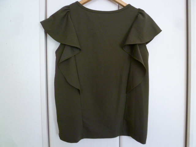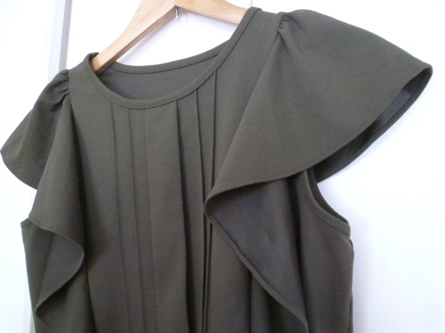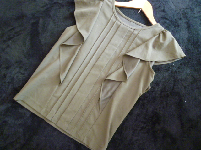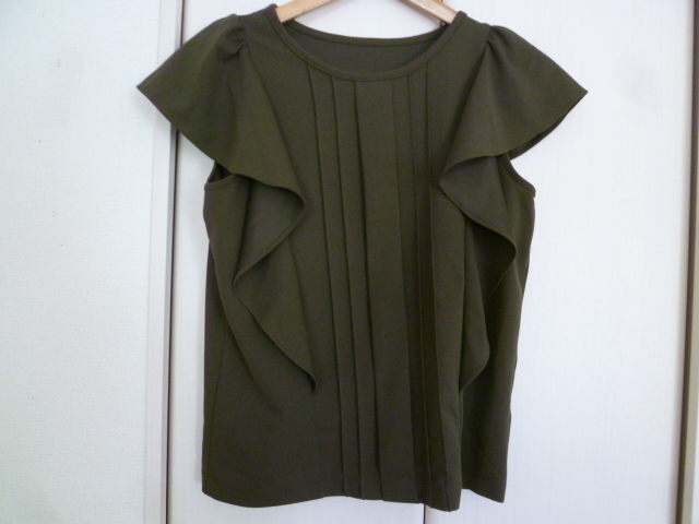 GU/ジーユー△深緑カーキ系センタープリーツ肩フリルデザインカットソーM/半袖トップス渋グリーン△BO61