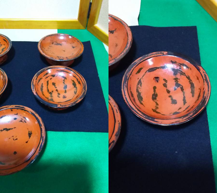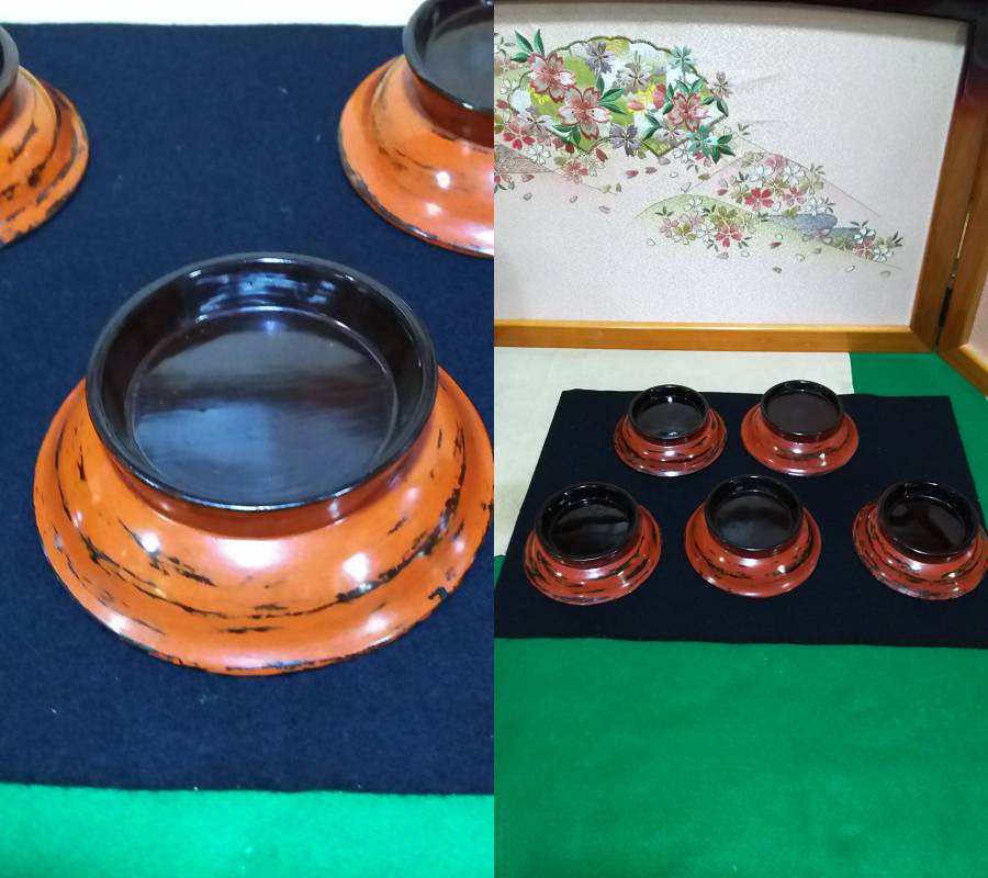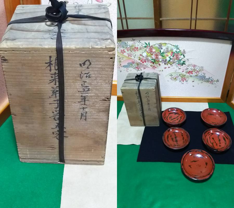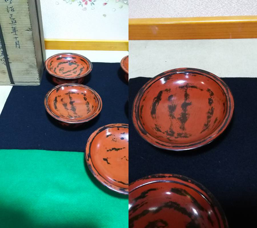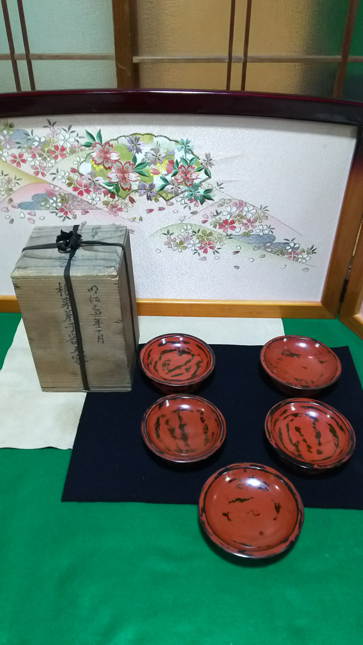 (鳥羽庵)うぶだし品神社仏閣時代品明治期根来塗菓子器5客セット時代箱付 商品サイズ径11、1センチ 高さ3,5センチ 商品状態説明神社仏閣時代品明治期根来塗菓子器5客セット時代箱付とても素敵な根来塗の菓子器1客時代高台微細削げ等ありますが後の4客状態もとても良い風合いがでてます。 詳しくは、写真ついてますので参照お願いします。(下にフォトアップ写真ついてますので参照お願いいたします。) 発送は、ゆうパックにて発送いたします。 落札後ヤフーシステム期間内すべて取り引きお願いします。