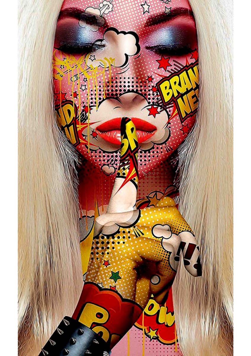 カラフルなアメリカンコミックオノマトペボディペイントのセクシーブロンドレディがアーティスティックなポップアートデザイン。