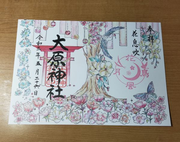 ◆大原神社(千葉・習志野・実籾)◆御朱印「花息吹」 令和3年(2021年)5月 新朱印帳記念・見開き |