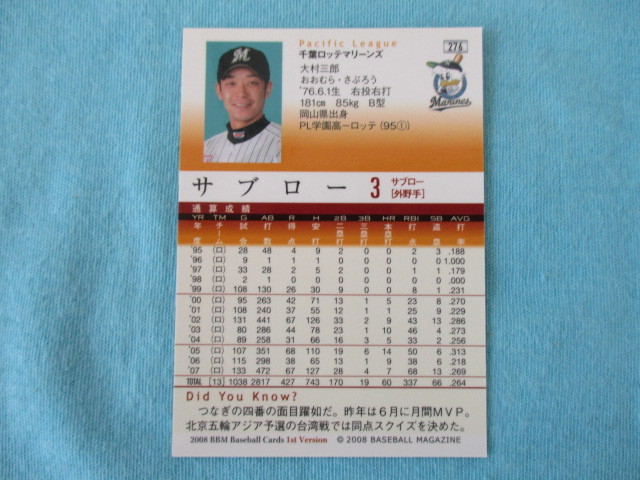 ★BBM 2008★1st Version〔276 サブロー 千葉ロッテマリーンズ〕トレカ♪