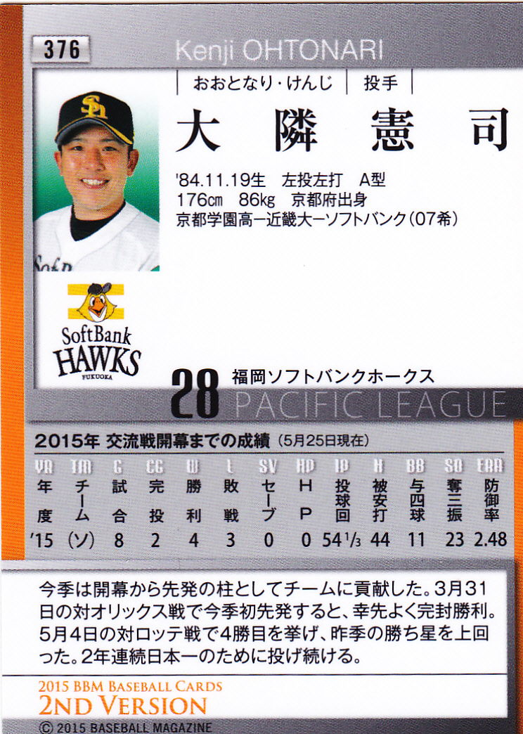 BBM2015ベースボールカード2nd 376 大隣憲司 京都府 京都学園 近畿大学 福岡ソフトバンクホークス