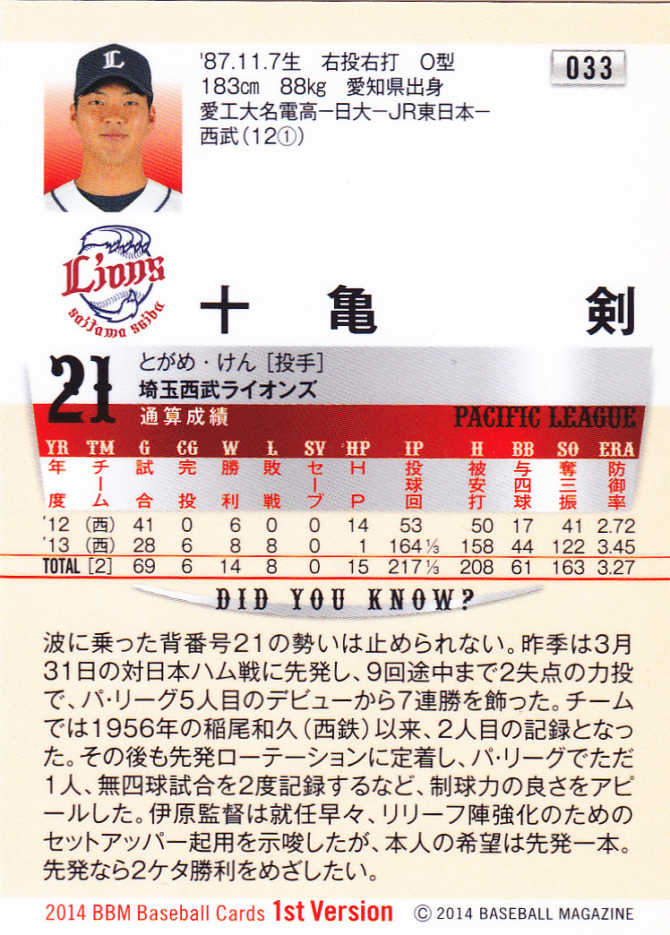 BBM2014ベースボールカード1st 033 十亀剣 愛知県 愛工大名電高校 日大 ドラフト1位 埼玉西武ライオンズ