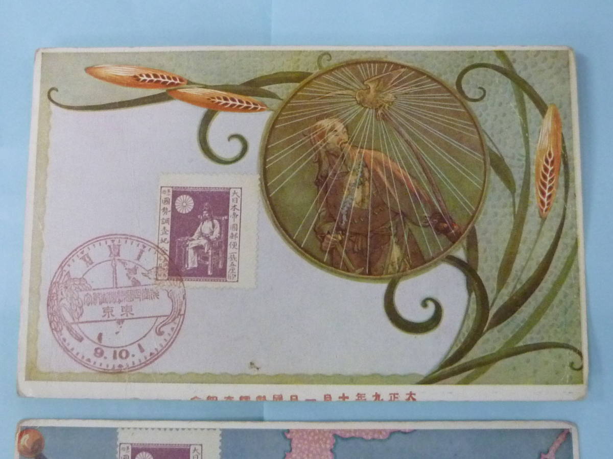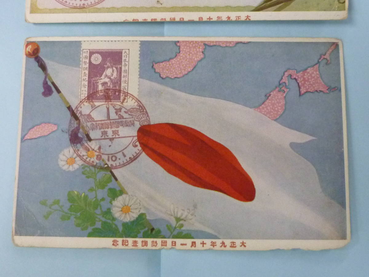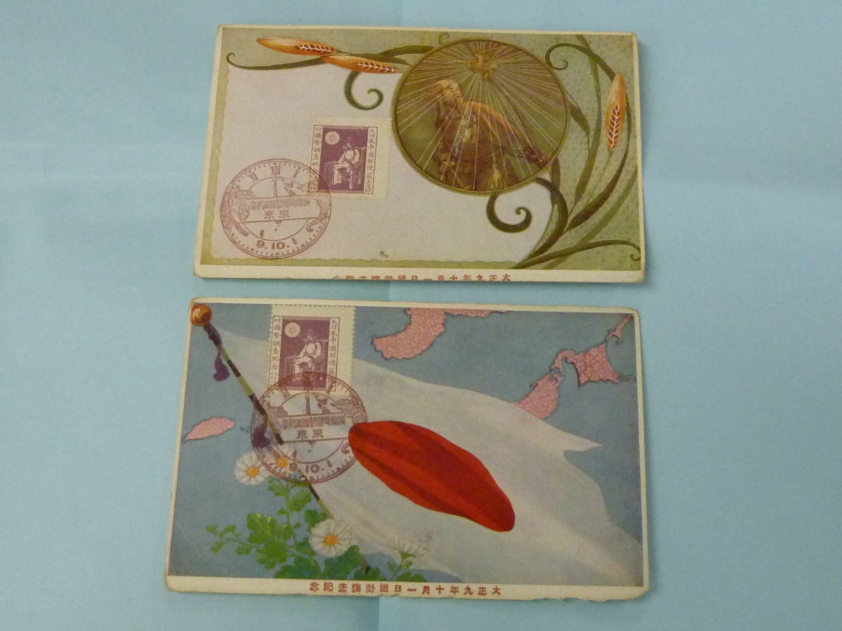 21MI S 絵葉書№133 日本はがき 大正 記念切手 1回国勢調査 1銭5厘貼 計2通 下部キズ有