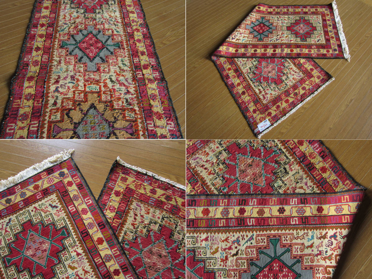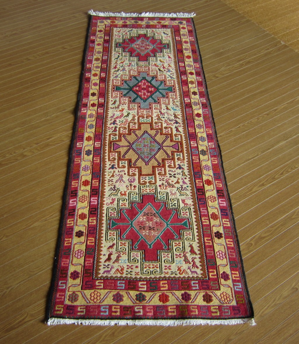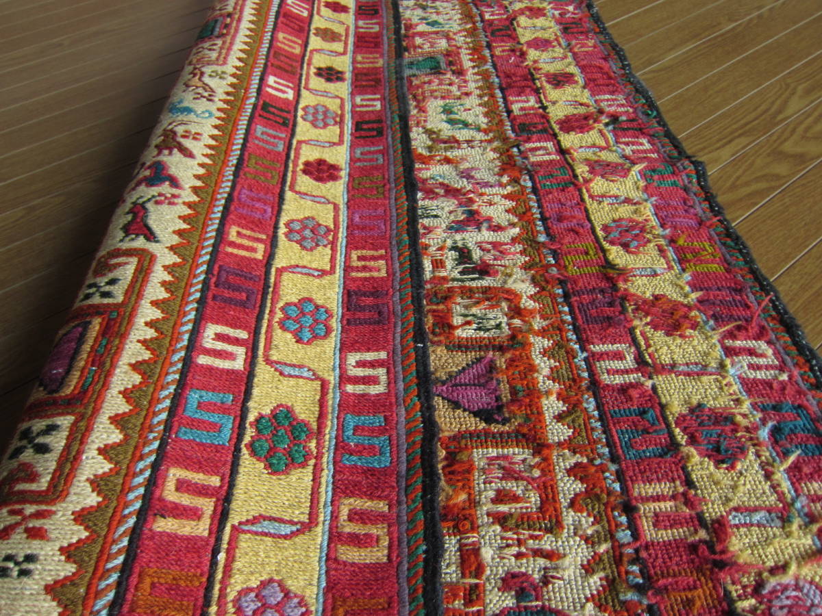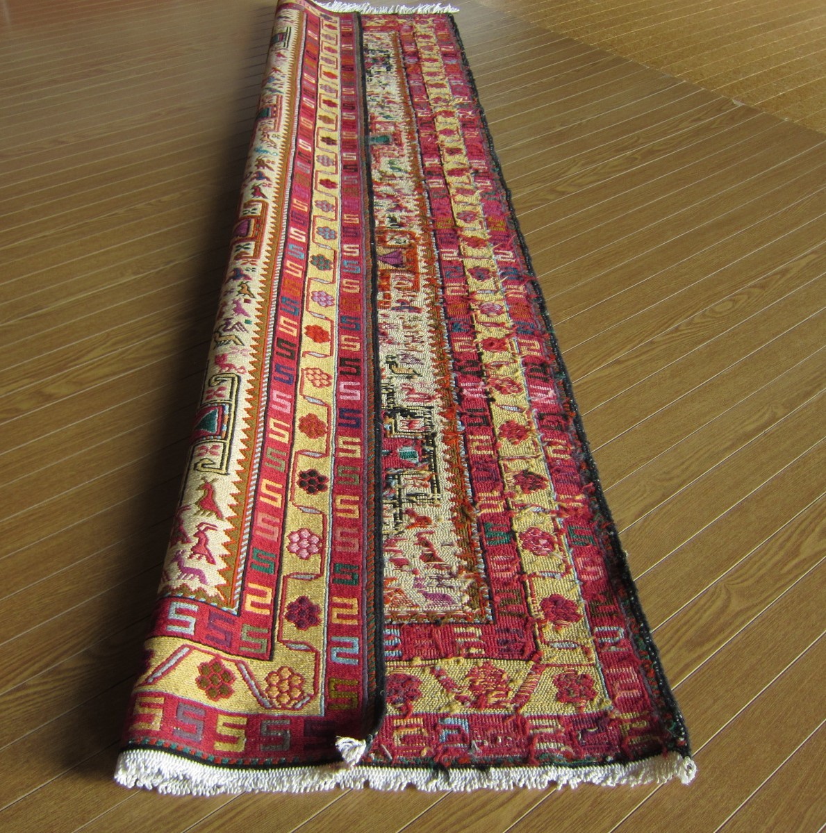 商品説明 | ★素材 : ウール・手織り・スマック織り ※スマック織りとは、イランのキリムの織り方の技法です。 土台の縦糸と横糸の上にもう一本横糸を絡めるように 巻き込んで織っていく高度なテクニックで、 刺繍のように細かな文様を描けることができます。 スマック織りは裏面に模様の糸を渡してあるので 片面使いのキリムになります。 ★サイズ : 約 197×72 cm (房を含まない長さです) ★産地 : イラン・アゼルバイジャン ★状態 : 新品 kxpgs342+ZIBACARPET絨毯 kxpgs342+ZIBACARPET取扱いペルシャ絨毯 FARSHEZIBA_KILIMキリム |