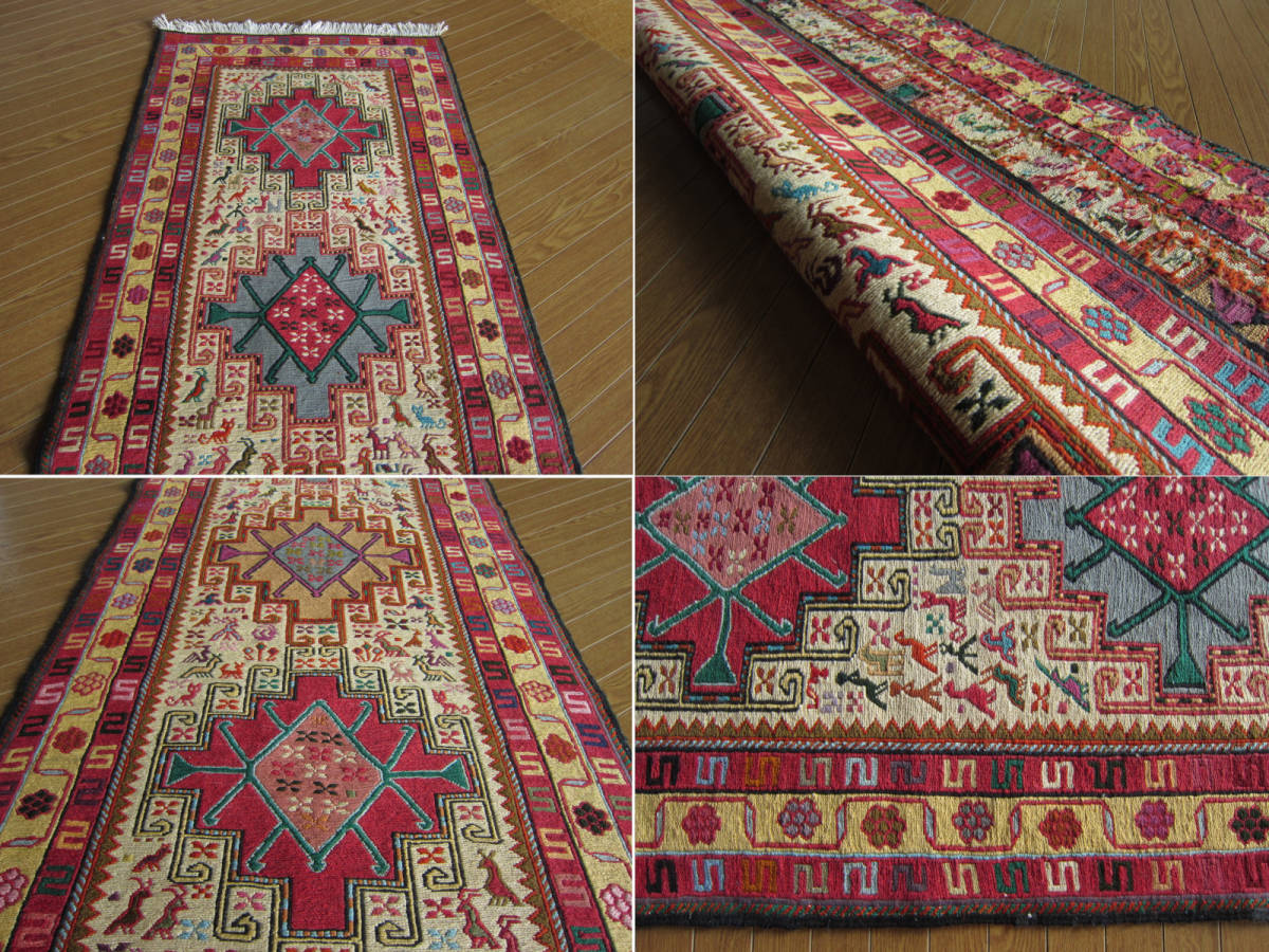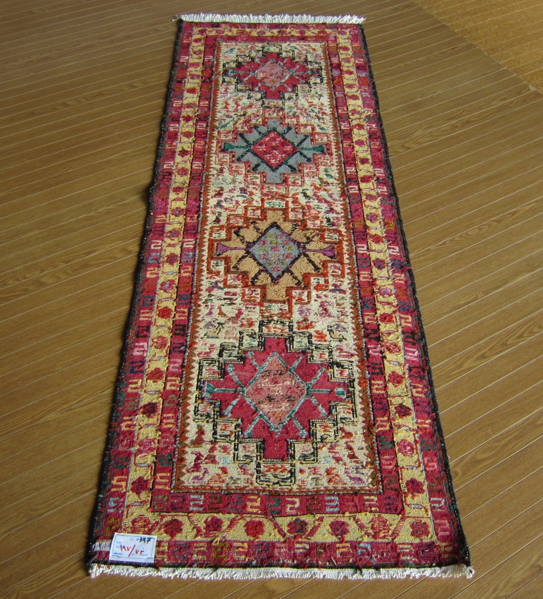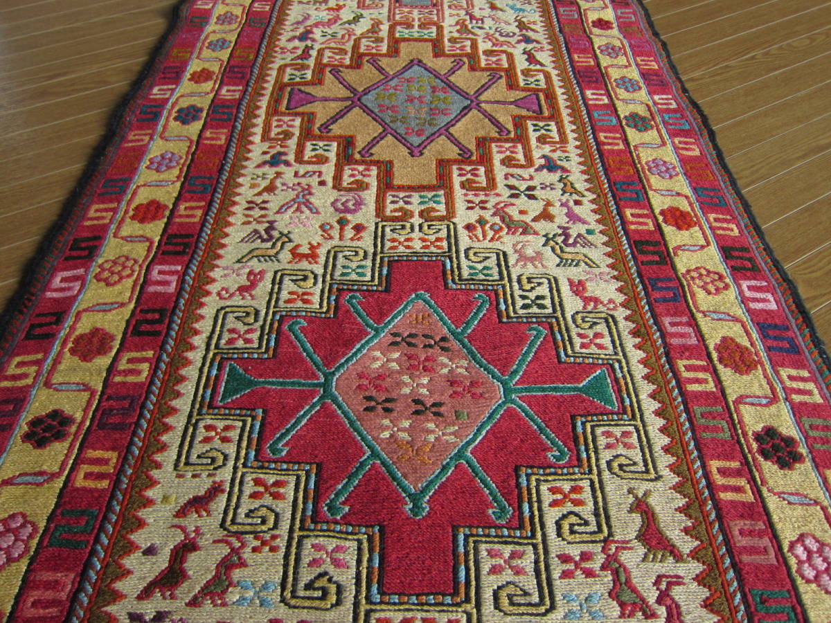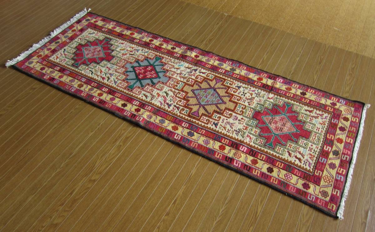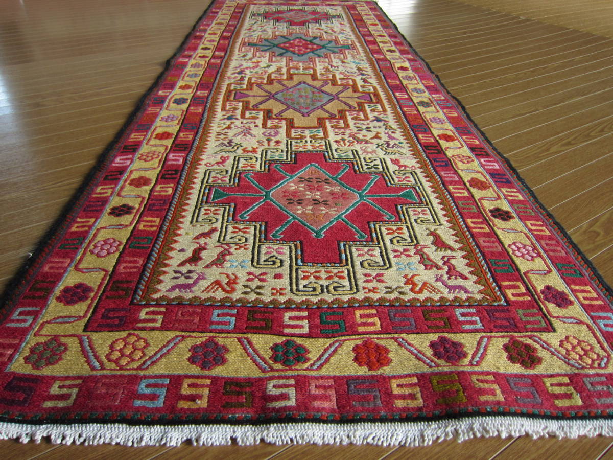 商品説明 | ★素材 : ウール・手織り・スマック織り ※スマック織りとは、イランのキリムの織り方の技法です。 土台の縦糸と横糸の上にもう一本横糸を絡めるように 巻き込んで織っていく高度なテクニックで、 刺繍のように細かな文様を描けることができます。 スマック織りは裏面に模様の糸を渡してあるので 片面使いのキリムになります。 ★サイズ : 約 197×72 cm (房を含まない長さです) ★産地 : イラン・アゼルバイジャン ★状態 : 新品 kxpgs342+ZIBACARPET絨毯 kxpgs342+ZIBACARPET取扱いペルシャ絨毯 FARSHEZIBA_KILIMキリム |