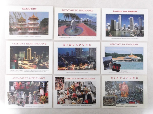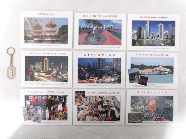 シンガポールの、マーライオンキーホルダー&美しい風景等のケース付 ポストカード(絵はがき)8枚セットです☆