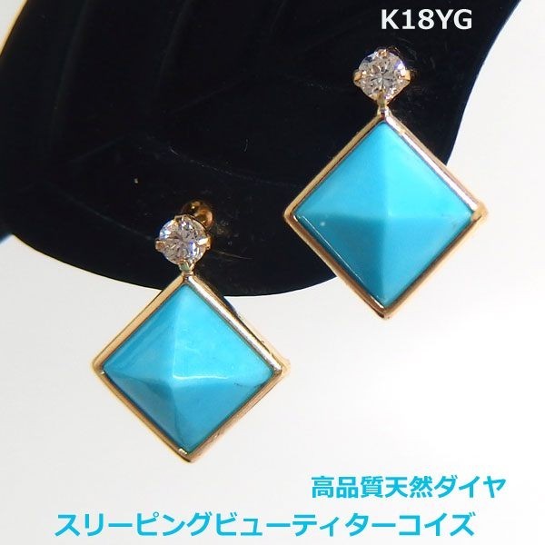 【送料無料】K18YGスリーピングビューティ天然ターコイズ&ダイヤピラミッドピアス■2252