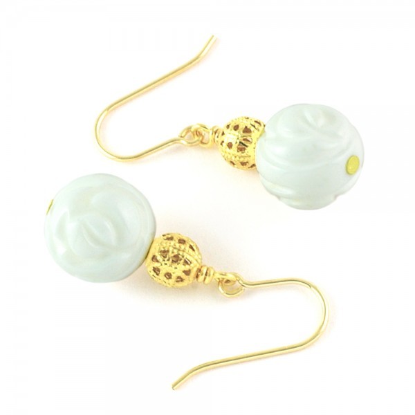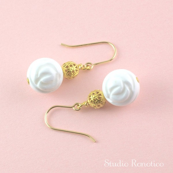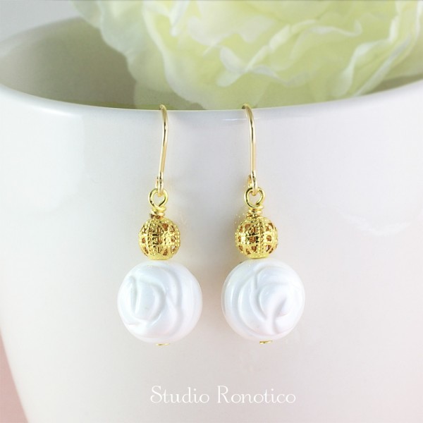 真っ白なホワイトシェルに薔薇彫刻が施された上品なデザイン 約12mmのホワイトパールボールの薔薇彫刻です。