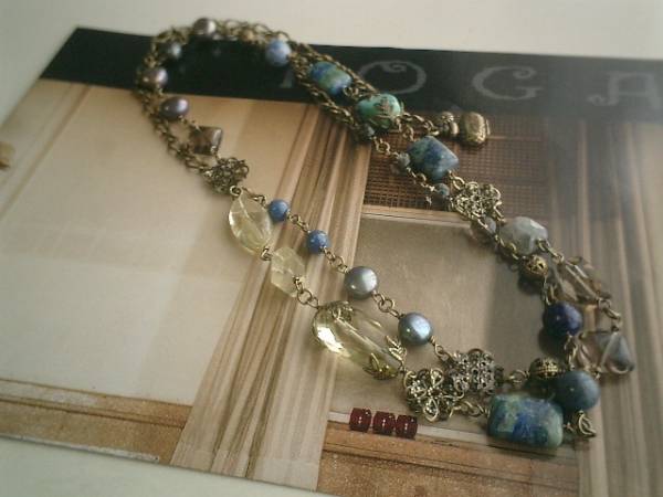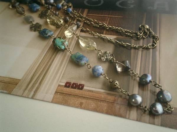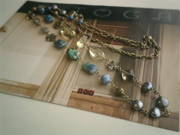 秋色コレクション・・シリーズです♪スクリーンに恋して・・繊細な石を集めたロマンチックなネックレスです♪10ミリのスクエア、12ミリ位のラフカット、6ミリのラウンドカットのスモーキークォーツや10ミリのスクエアカットのラブラドライト、10×14ミリのレグタングルのクリソコラ、8ミリのデニムラピス、座金でおめかしした20ミリ×14ミリのレモン水晶、ラフカットのレモン水晶、マーキスのシトリン、座金でおめかししたターコイズやパープルグレーの淡水パールなど表情豊かな石や透かしチャームをアートっぽくまとめてみました♪長さは全長95センチ位で調節自由です♪画像のように2連にされても素敵です♪お揃いのブレスレットも出品しています♪シンプルで長く着けていただけるデザインを考えて作りました♪ハンドメイドをご理解頂いてノークレーム、ノーリターンでお願いします