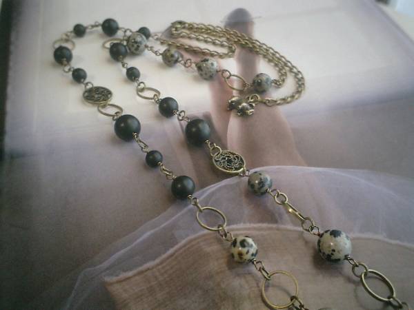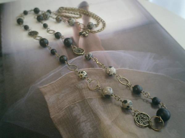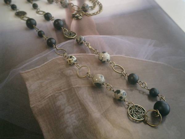 秋のヒロイン・・シリーズです♪シックな黒とブラウンのネックレスです♪秋色の異素材やオニキスを合わせて大人のロマンチックしています♪オニキスはやさしい黒のマットオニキスです♪6ミリ、8ミリ、10ミリの丸玉のオニキスにキュートなダルメシアンの8ミリ、10ミリの丸玉やデザインチャームを合わせました♪長さは全長88センチ位で調節自由です♪2連にされても素敵です♪お揃いのネックレスやブレスレットも出品しています♪シンプルで合わせやすいデザインを考えて作りました♪ハンドメイドをご理解いただいてノーリターン、ノークレームでお願いします♪