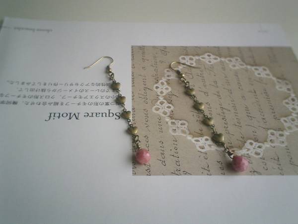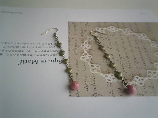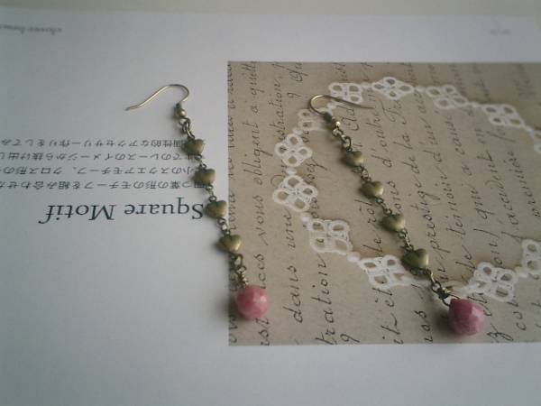 エキセントリック少女・・シリーズです♪薔薇色に恋して・・キュートなロードナイトのピアスです♪ペア1組です♪7×9ミリのドロップカットのロードナイトにハートのデザインチェーンを合わせてアンティークモダンな表情です♪長さは8・5センチ位です♪♪イヤリングにも変更出来ます♪お揃いのネックレスやブレスレットも出品しています♪シンプルで長く着けていただけるデザインを考えて作りました♪ハンドメイドをご理解頂いてノークレーム、ノーリターンでお願いします