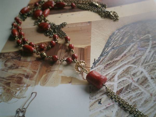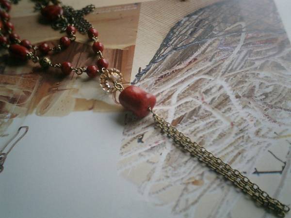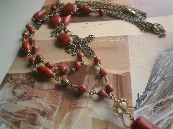 異国に旅して・・シリーズです♪赤い刺繍のチャイナ服に・・オリエンタルモダンな表情のネックレス2本セットです♪シックな大人色の赤のネックレスのデザイン違いです♪重ねてネックレスに1本をブレスレットにといろいろに楽しんでいただけます♪長い方のネックレスは6ミリの丸玉、8×15ミリ位のナツメ型の赤のスポンジ珊瑚に6ミリの丸玉、40×20ミリ位のクロスの透かしチャームやデザイン樹脂ビーズを合わせてひっそりロマンチックしています♪トップは15×10ミリ位のスポンジ珊瑚にチェーンを合わせました♪長さは全長77センチ位で調節できます♪トップはチェーンを入れて11センチ位です♪短い方のネックレスは6ミリの丸玉、13×18ミリのフラットオーバルのスポンジ珊瑚に11ミリのお花のチャームを合わせて可憐な表情です♪長さは全長57センチ位で調節自由です♪チョーカー風にされたりブレスにされても素敵です♪それぞれ単品やお揃いのブレスレットやピアスも出品しています♪シンプルで飽きのこないいつまでも着けられるデザインを考えて作りました!ハンドメイドをご理解頂いてノークレーム、ノーリターンでお願いします