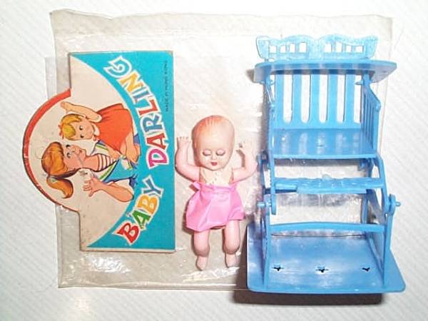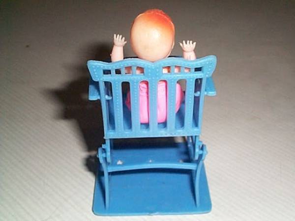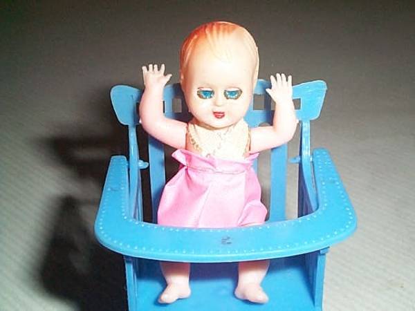 未使用品です。メーカーマークはタグ(ヘッダー)、椅子についていますがわかりません。メーカー不明です。香港製です。撮影の為 袋を開封しました。汚れがあります。人形サイズ約7㎝位です。人形を寝せると目を閉じます。人形を起すと目が明きます。両手足上げ下げできます。人形の材質は頭と体の部分はプラ製で両手足はビニール製です。人形の背中部分と椅子の底面にMADE IN HONG KONG の刻印があります。 タグ(ヘッダー)にもMADE IN HONG KONGの文字の印刷があります。椅子のサイズは高さ約9㎝位です。椅子の材質はビニール製で変形しています。