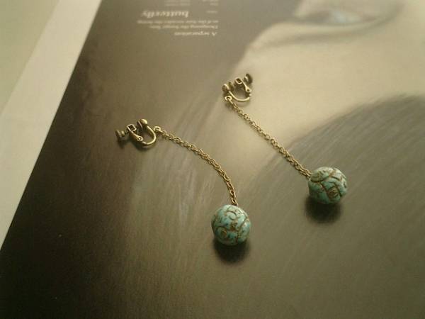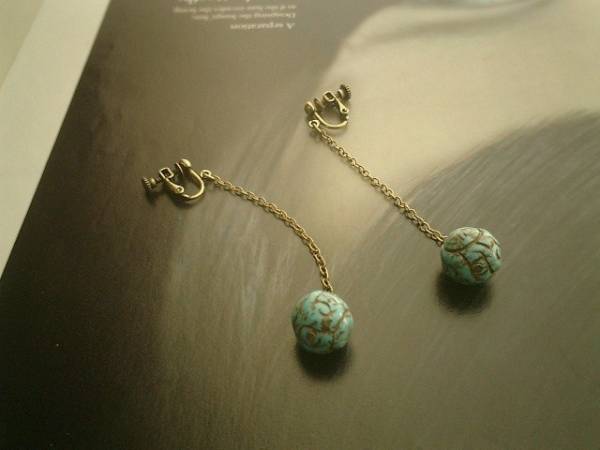 自分探しの旅・・シリーズです♪オリエンタルロマンに染まって・・チャイナ仕様の石を集めてシックなイヤリングです♪ペア1組の出品です♪12ミリのお花彫りのマグネサイトターコイズに繊細なチェーンを合わせて大人の表情です♪長さは全長8センチ位です♪ピアスにも変更出来ます♪♪お揃いのネックレスやブレスレットも出品しています♪シンプルで飽きのこないいつまでも着けられるデザインを考えて作りました!ハンドメイドをご理解頂いてノークレーム、ノーリターンでお願いします