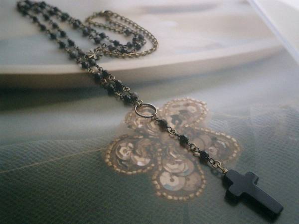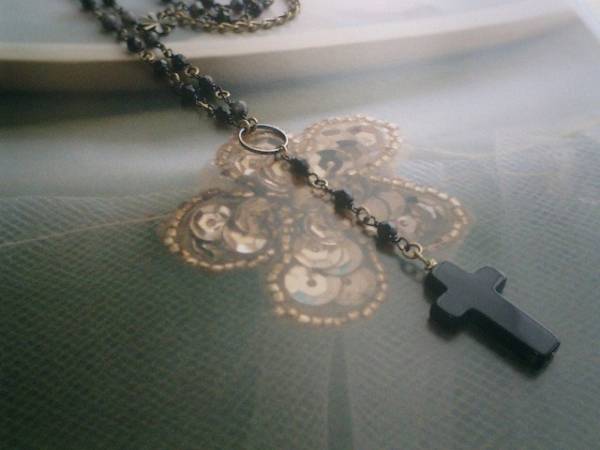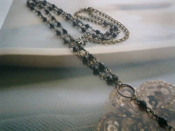 センチメンタル・ガール・・シリーズです♪切ない思い・・シックなオニキスのネックレスです♪4ミリのランダムカットのオニキスに4ミリの丸玉のラブラドライトを合わせてさりげなくロマンチックしています♪トップに15×25ミリのオニキスのクロスを合わせてラリエット風のデザインです♪長さは70センチ+アジャスター14センチで最長84センチ位です♪トップは8・5センチ位です♪♪お揃いのネックレスやブレスレットも出品しています♪♪シンプルで飽きのこないいつまでも着けられるデザインを考えて作りました!ハンドメイドをご理解頂いてノークレーム、ノーリターンでお願いします