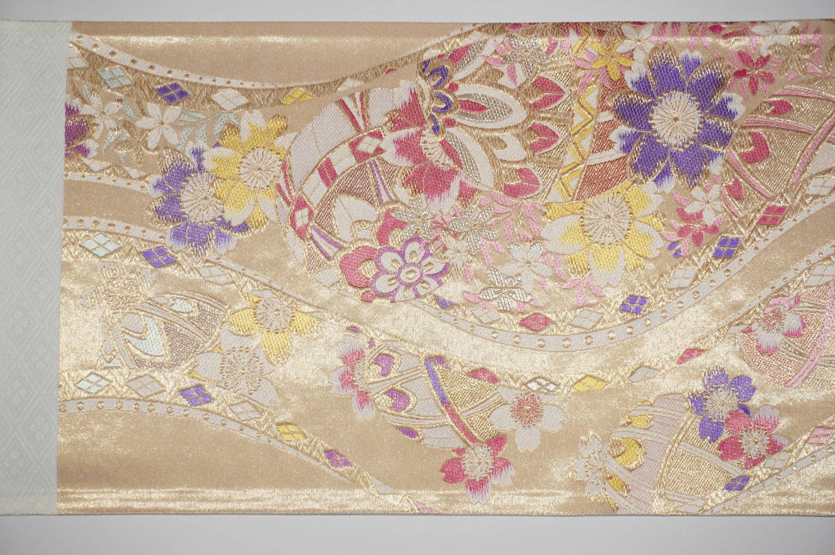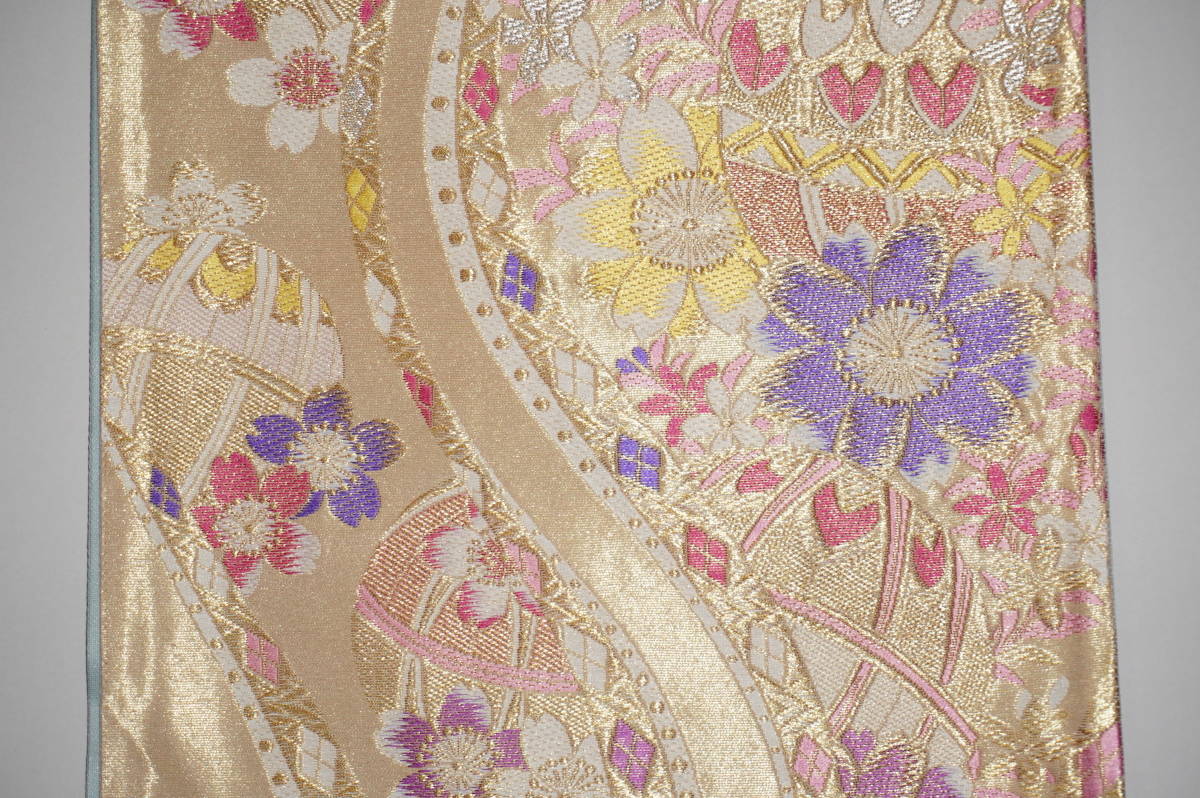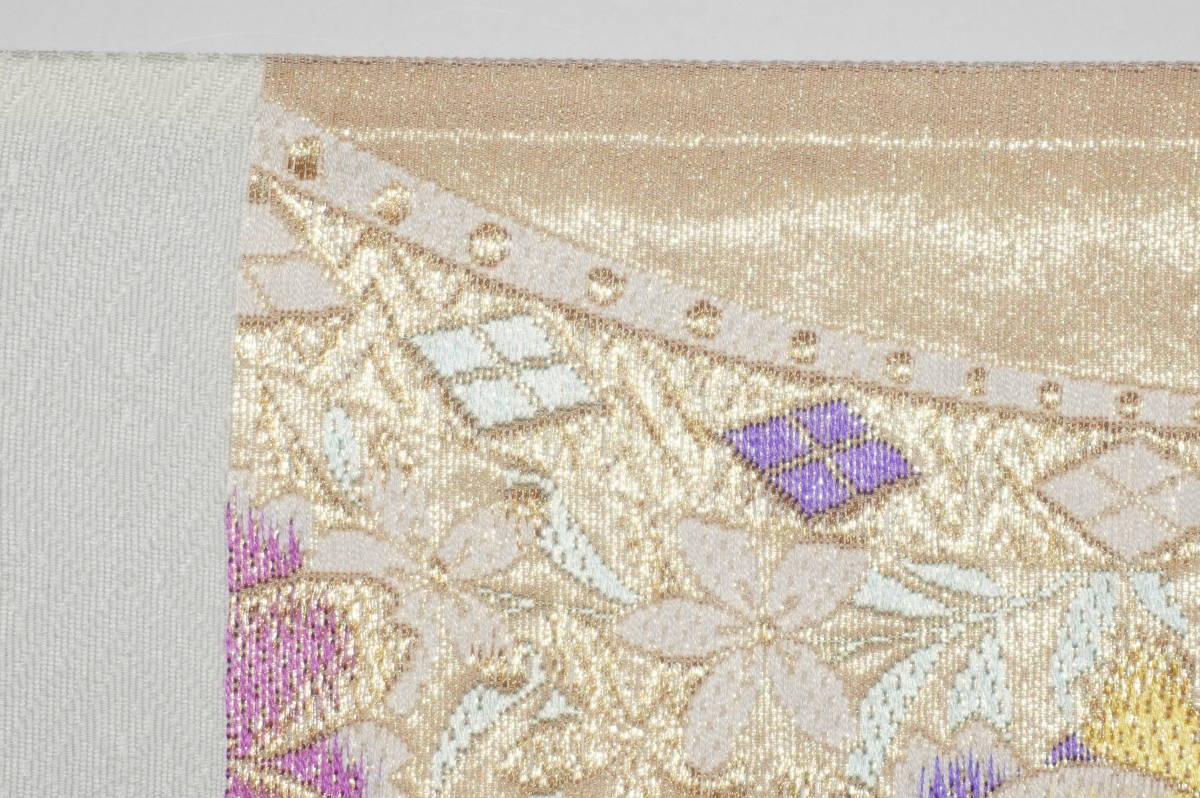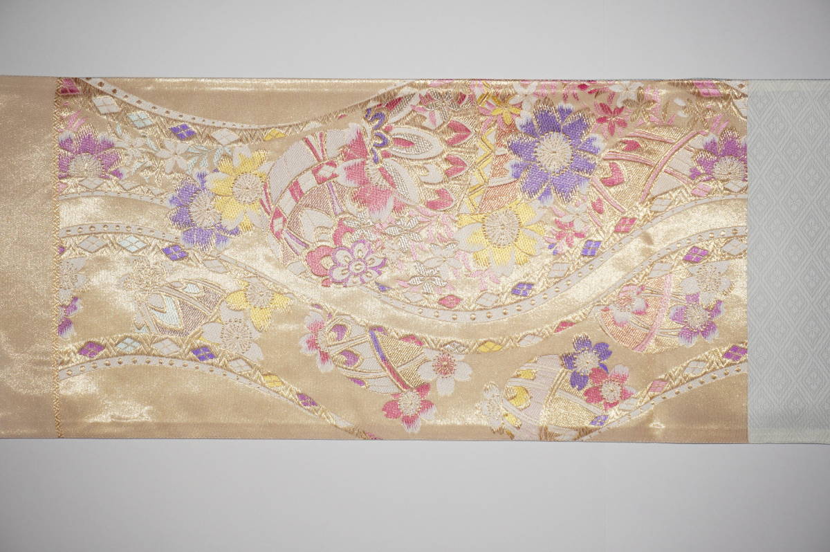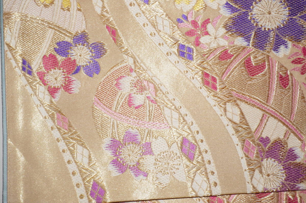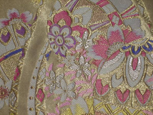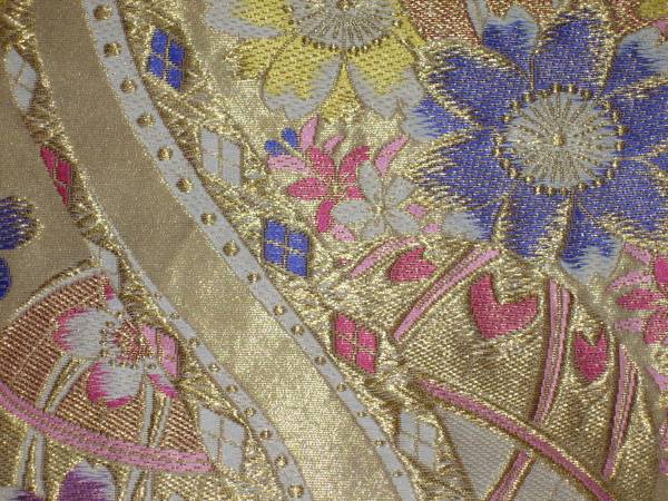 なお、帯柄左上に無地で出ているところは裏無地で、柄と柄の間に出ているところは手先と前太鼓のあいだの無地部分です。六通柄です。金銀糸が多用されているためストロボの照りで、しろぽく写っている部分があります