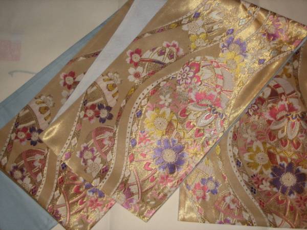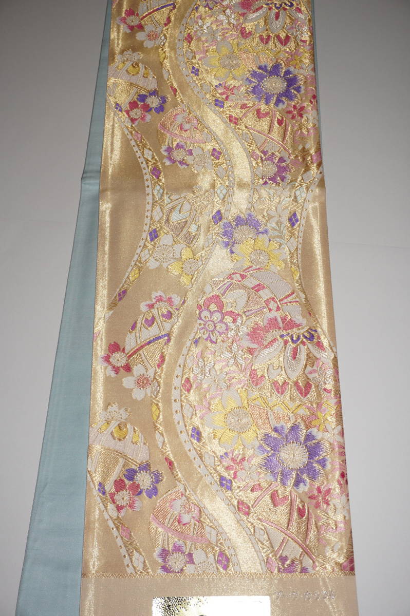 仕立てつき振袖用帯 西陣6通柄袋帯 薄金地(裏地くすみ水色系) 絹100%(新表示:絹80%指定外繊維(紙、金属糸風)20%)  新品み仕立て品ですがこのお値段で仕立てつきで、納品です。なお、最終日まで待っていただかなくとも、入札した時点でオークションは終了し落札者となります。お値段的にもお安く設定いたしましたお買い得品です(西陣帯です)。もちろん芯込みの仕立て付きですが、仕立てなしの場合でも金額は変わりません。