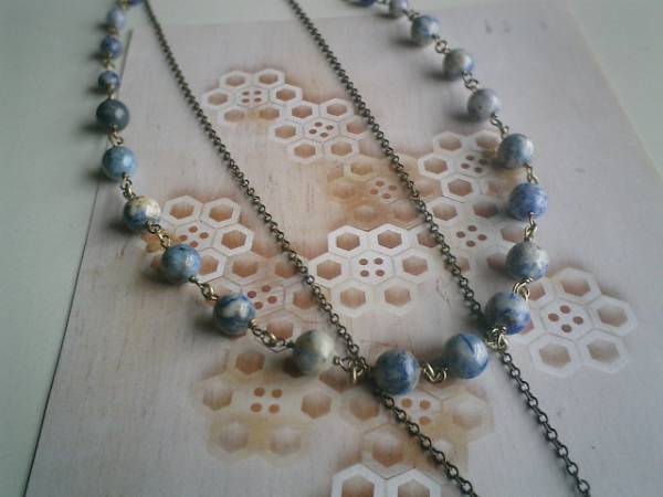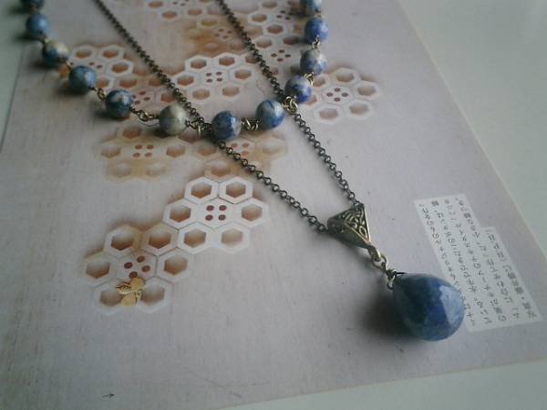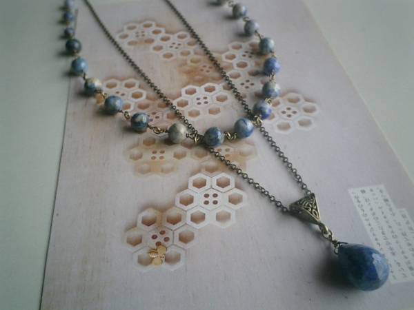 デニム・コレクション・・シリーズです♪初夏のブルー色・・爽やかなラピスのネックレス2本セットです♪♪深い藍色やブルーグレーや群青色がアートな表情のデニムラピスは6ミリと8ミリの丸玉です♪シンプルで合わせやすいデザインです♪長さは全長62センチ位で調節自由です♪チョーカー風にされても素敵です♪長い方のネックレスは繊細なチェーンに18×13ミリ位のラピスラズリのドロップカットを合わせました♪クラシカルな座金でおめかししてアンティークモダンしています♪長さは76センチ+アジャスター10センチで最長86センチ位です♪♪同じシリーズのネックレスやブレスレットも出品しています♪♪シンプルで飽きのこないいつまでも着けられるデザインを考えて作りました!ハンドメイドをご理解頂いてノークレーム、ノーリターンでお願いします