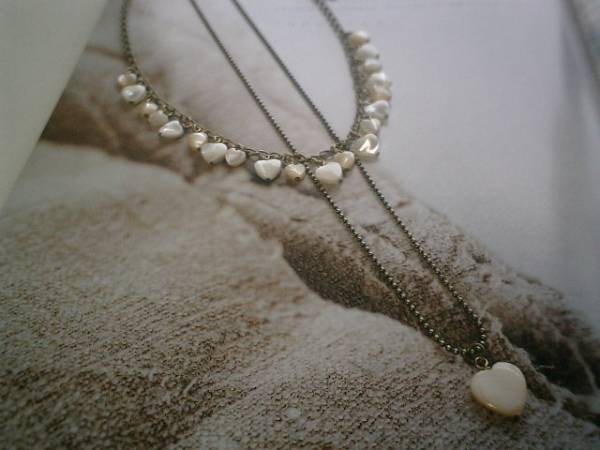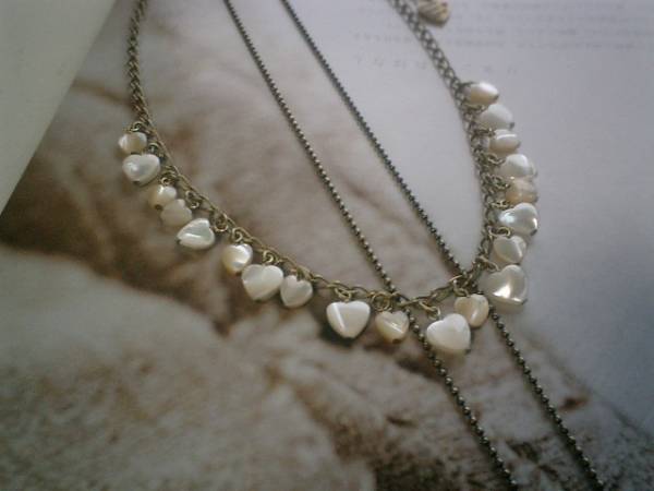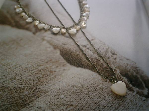 薔薇の香りの女の子・・シリーズです♪オフホワイトのマザーオブパールのネックレス2点セットです♪2本、単品でと色々に楽しんでいただけます♪7ミリ、9ミリの大きさ違いのハートのマザーオブパールはランダムに繋いでキュートな表情です♪長さは全長57センチ位で調節自由です♪チョーカー風にされてもブレスにされても可愛いです♪14ミリ位のハートのマザーオブパールは華奢なボールチェーンを合わせました♪長さは70センチ+アジャスター12センチで最長82センチ位です♪♪それぞれ単品やお揃いのブレスレットやイヤリングも出品しています♪♪シンプルで長く着けていただけるデザインを考えて作りました♪ハンドメイドをご理解頂いてノークレーム、ノーリターンでお願いします