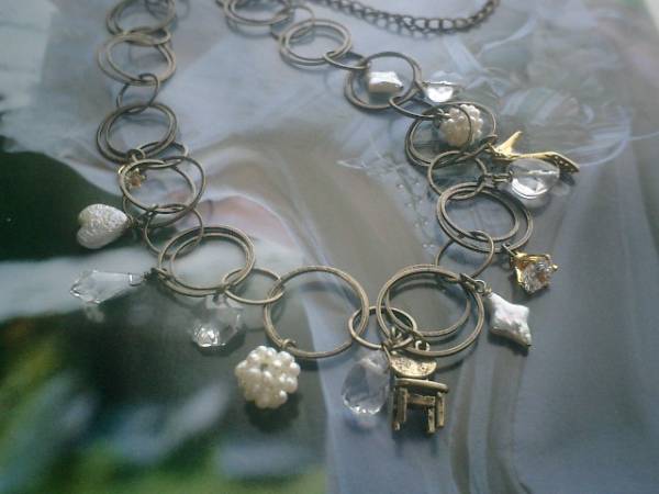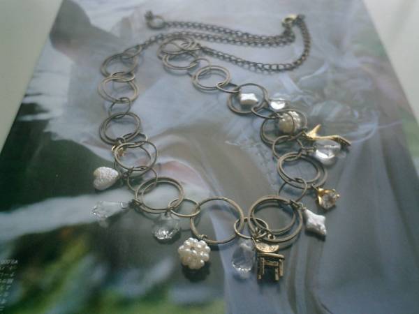 シック・フレンチの定義・・シリーズです♪スワロと水晶と・お気に入りを集めたネックレスです♪デザインチェーンにスワロや水晶や淡水パールやジルコニアを集めてさりげなくロマンチックしています♪スワロは16ミリのドロップカットや12ミリのヘキサゴン、水晶は10ミリ、12ミリのハートカット、14ミリのドロップカット、淡水パールは12ミリのハート、12ミリのダイヤ型、12ミリ、14ミリのパール玉、ジルコニアは8ミリのリング型です♪チェアーやパンプスのチャームを合わせました♪長さは全長74センチ位で調節自由です♪チョーカー風にされても素敵です♪♪お揃いのブレスレットも出品しています♪♪シンプルで飽きのこないいつまでも着けられるデザインを考えて作りました!ハンドメイドをご理解頂いてノークレーム、ノーリターンでお願いします