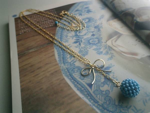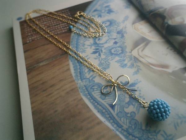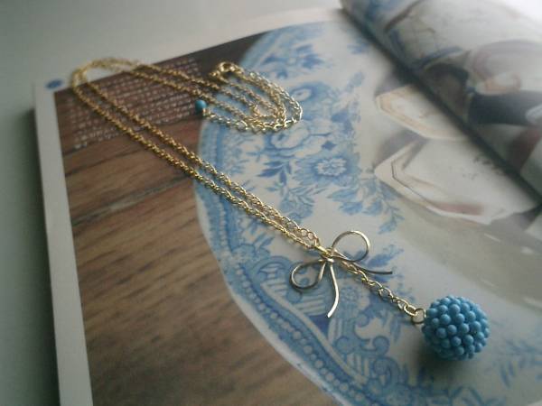ジゼルの季節・・シリーズです♪ナチュラルデニムの香り・・キュートなトルコ石のネックレスです♪繊細なチェーンにトップはドイツ製のトルコ石(練り)の14ミリ位の編みボールです♪リボンのチャームを合わせてキュートな表情です♪長さは全長73センチ位で調節自由です♪お揃いのネックレスやブレスレットやピアスも出品しています♪シンプルで飽きのこないいつまでも着けられるデザインを考えて作りました♪ハンドメイドをご理解頂いてノークレーム、ノーリターンでお願いします