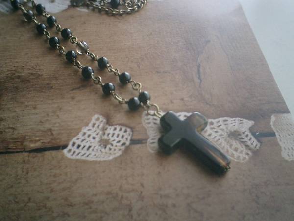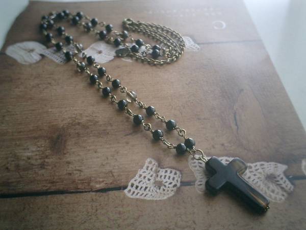 ロゼッタのおめかし・・シリーズです♪薔薇とクロス・・シックなクロスのネックレスです♪♪オニキスやスモーキークォーツなど秋色の素材を合わせました♪30×20ミリのオニキスのクロスは6ミリの丸玉のオニキスやスモーキークォーツを合わせてアンティークモダンな表情です♪長さは全長82センチ位で調節自由です♪お揃いのネックレスやブレスレットやピアスも出品しています♪♪シンプルで長く着けていただけるデザインを考えて作りました♪ハンドメイドをご理解頂いてノークレーム、ノーリターンでお願いします
