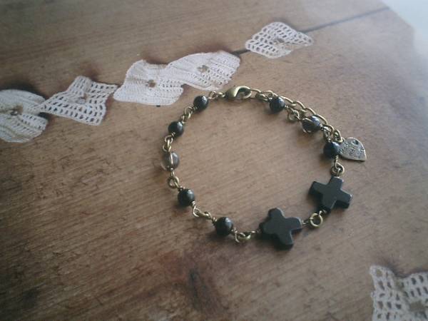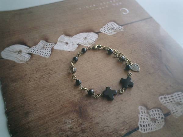 ロゼッタのおめかし・・シリーズです♪薔薇とクロス・・シックなクロスのブレスレットです♪♪オニキスやスモーキークォーツなど秋色の素材を合わせました♪12ミリのオニキスのクロスは6ミリの丸玉のオニキスやスモーキークォーツを合わせてアンティークモダンな表情です♪長さは全長23センチ位で調節自由です♪お揃いのネックレスやブレスレットやピアスも出品しています♪♪シンプルで長く着けていただけるデザインを考えて作りました♪ハンドメイドをご理解頂いてノークレーム、ノーリターンでお願いします