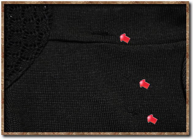 未使用品ですが2枚目の写真の×の位置に糸が抜けて線が走っている箇所があります。 7枚目に拡大写真を載せてありますのでご確認ください。 生地は薄めで裏地はありません。 |