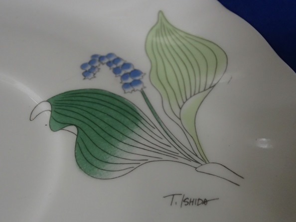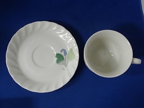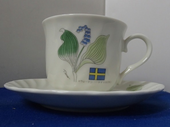 T.ISHIDAサイン ドイツスズラン絵 スェーデン国旗<未使用>[カップ]口径8cm 底径6cm 高台外径4cm 高さ6.5cm 140g [ソーサー]直径13.8cm 底径8cm 高さ2cm 150g [外箱込み]15×15×8cm 369g 状態:本体良、外箱に経年変色