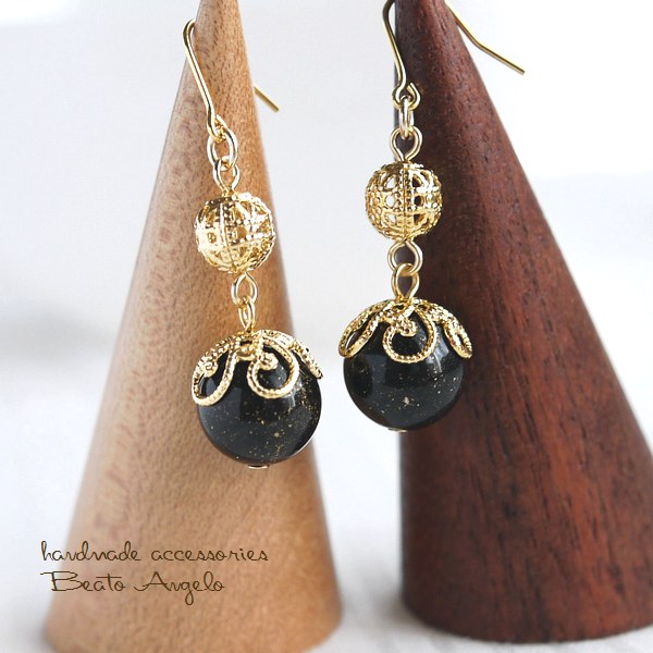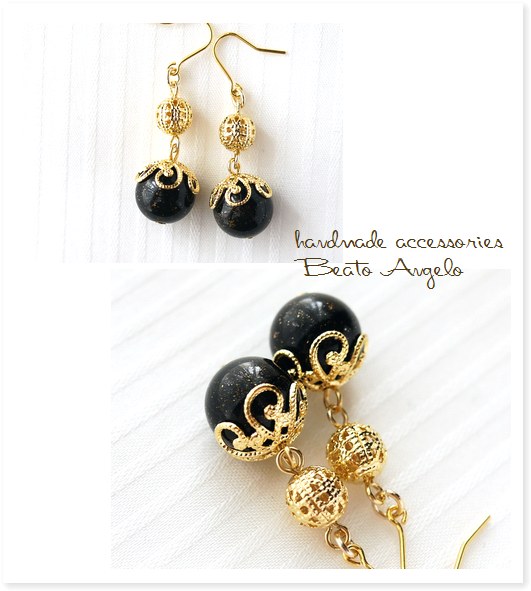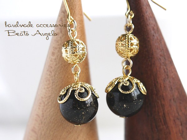 ドイツビーズと透かし玉のピアス(p-059)ブラックフレーク G