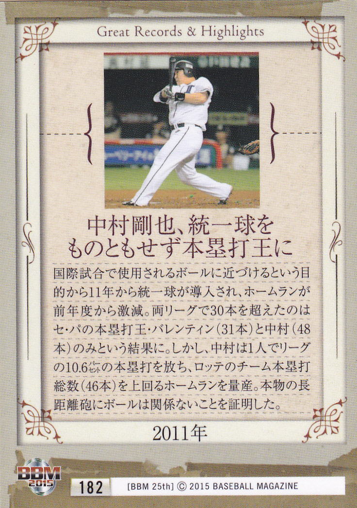 BBM2015ベースボールカード25th アニバーサリー 182 中村剛也 大阪府大東市 寺川ブラックス 四条中学校 大阪桐蔭高校 西武