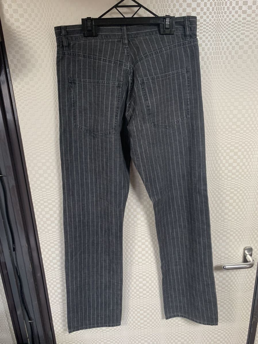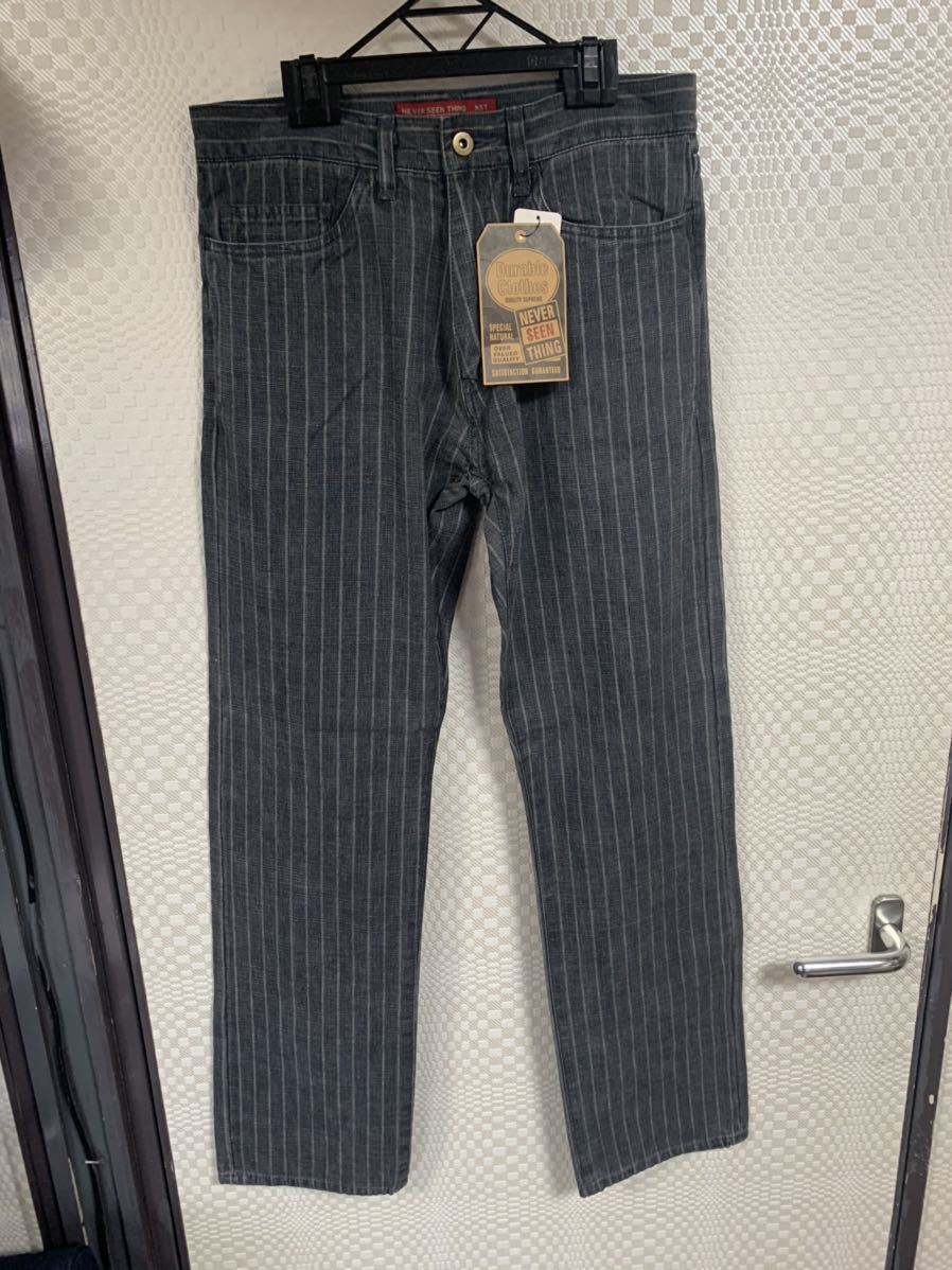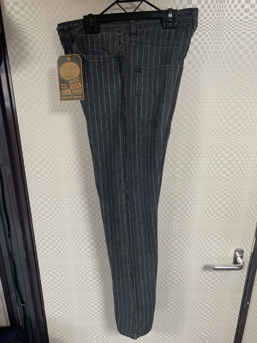 新品タグ付きのNEVER SEEN THINGのストライプコットンパンツです。サイズ29表記で平置きウエスト39股下81裾幅21センチ位です。