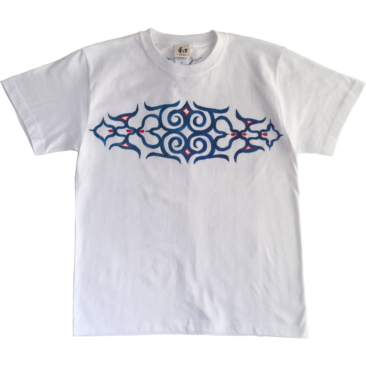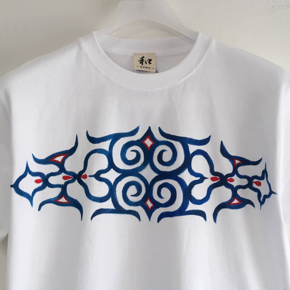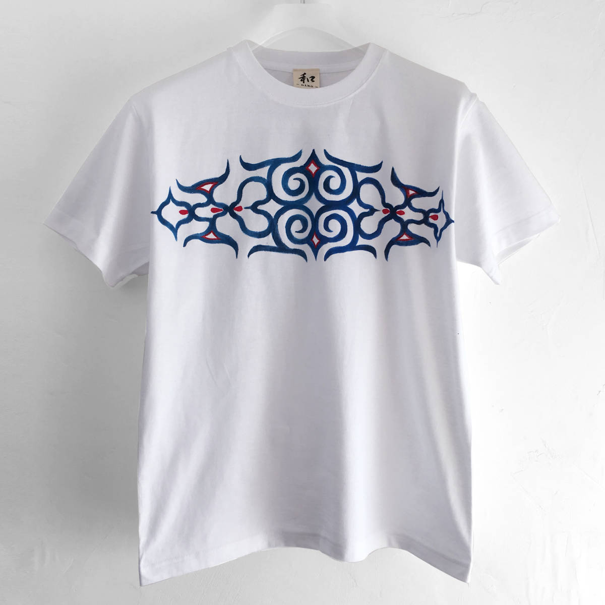 ご覧いただきありがとうございます。 一つ一つ丁寧に手描きで絵付けし、筆跡やカスレなどがプリントTシャツとは一味ちがう手描きならではの味わいとなっております。 日本の伝統民族の着物や民族衣装の文様をイメージした唐草文様を藍色で描きあげました。フロントには横一文字に唐草の文様を、後ろ襟首にはフクロウをイメージした文様を描いています。 オリエンタルなデザインの文様シャツは季節を問わず身につけられるアイテムです。 とてもインパクトのある個性的でアートなTシャツです。 個性的でモダンなデザインはお誕生日プレゼントや父の日のギフトにおススメです。 カラー:ホワイト サイズ:M M:身丈 73cm 身幅 54cm 肩幅46cm 袖丈 62cm 素材:綿100% | |||
