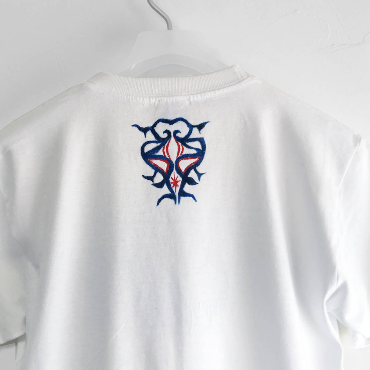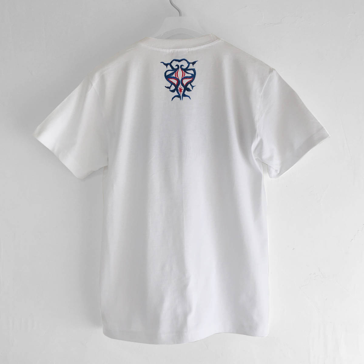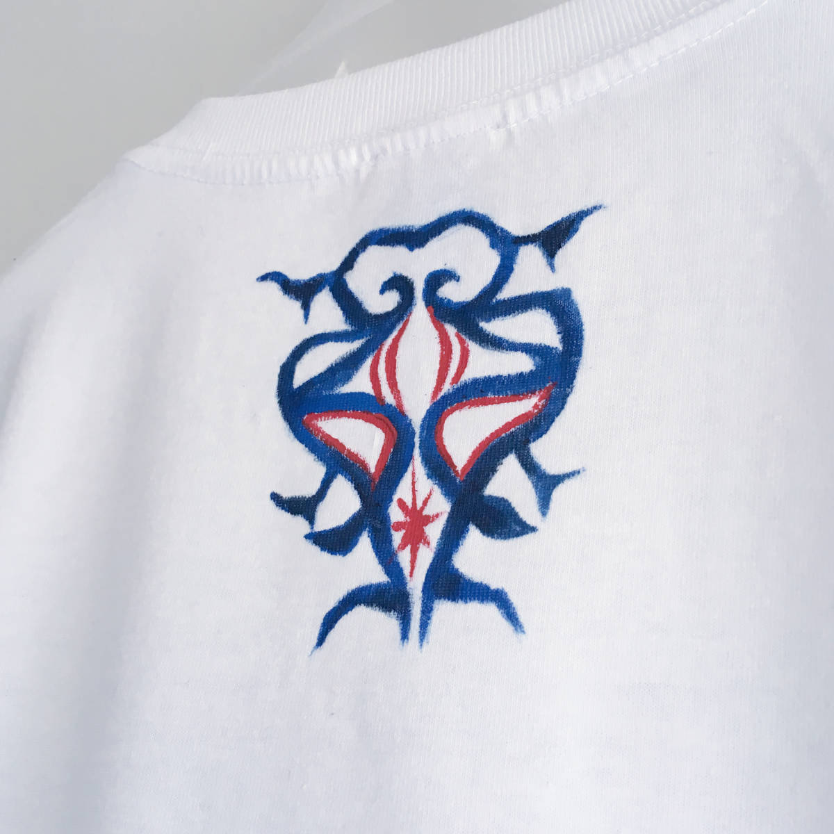 ご覧いただきありがとうございます。 一つ一つ丁寧に手描きで絵付けし、筆跡やカスレなどがプリントTシャツとは一味ちがう手描きならではの味わいとなっております。 日本の伝統民族の着物や民族衣装の文様をイメージした唐草文様を藍色で描きあげました。フロントには横一文字に唐草の文様を、後ろ襟首にはフクロウをイメージした文様を描いています。 オリエンタルなデザインの文様シャツは季節を問わず身につけられるアイテムです。 とてもインパクトのある個性的でアートなTシャツです。 個性的でモダンなデザインはお誕生日プレゼントや父の日のギフトにおススメです。 カラー:ホワイト サイズ:M M:身丈 73cm 身幅 54cm 肩幅46cm 袖丈 62cm 素材:綿100% | |||
