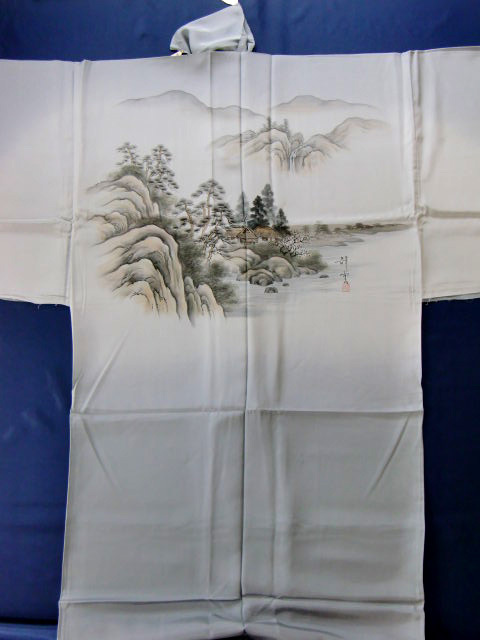 【新品】男性用 正絹 手描き友禅長襦袢 山水 グレー