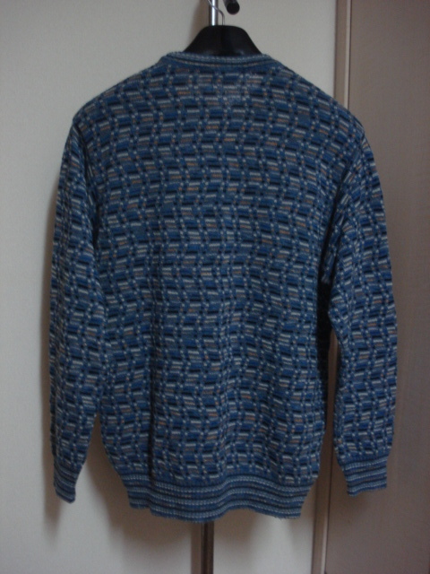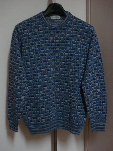 格安イタリア製トラッド系モデル・MODA EGREGIA・品が良く高級感のある綺麗なブルー系多色使い織柄地・高級丸首系デザインセーター M~L位になります。