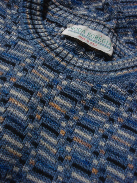 イタリア製高級ブランド MODA EGREGIA の品が良く高級感のある綺麗なブルー系多色使い織柄地・高級丸首系デザインセータータイプのお洒落でかっこいい高級トラッド系レアアイテムです。