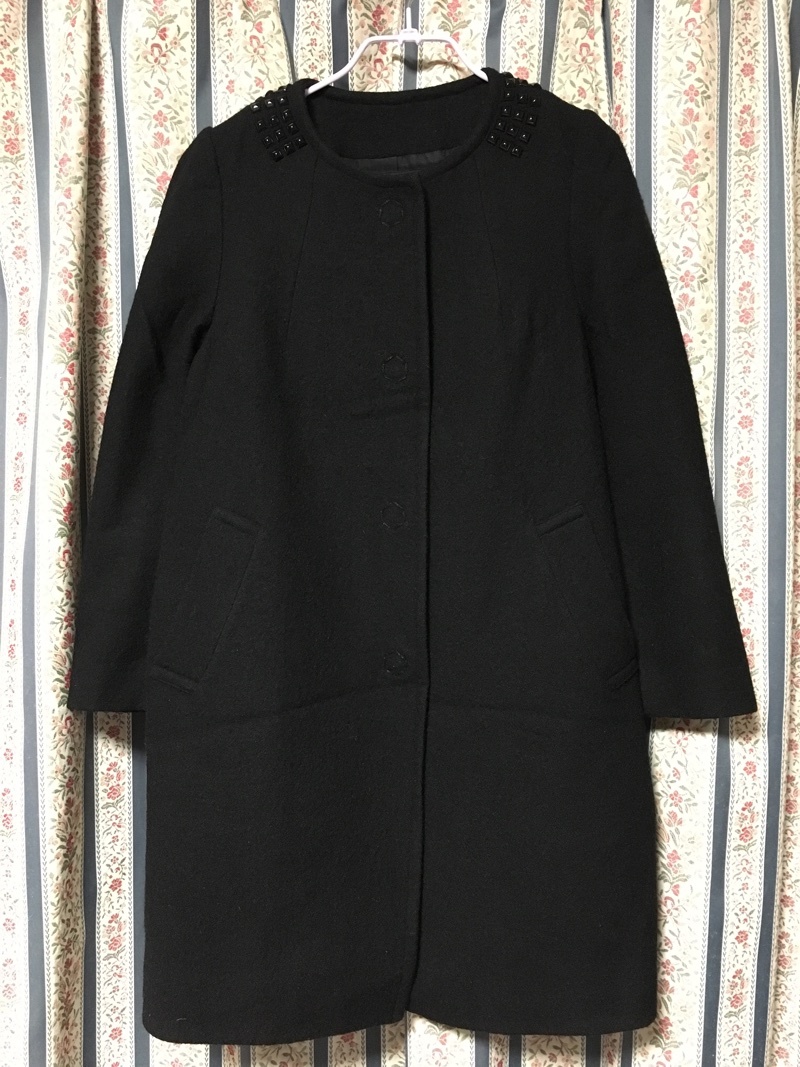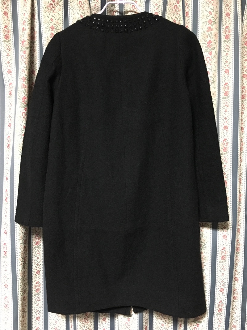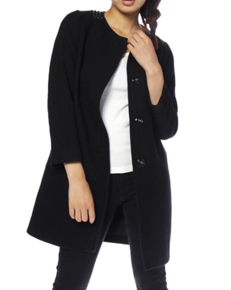 ノーカラーの襟ぐり部分に同色のスタッズがあしらわれたコクーンシルエットのデザイン。