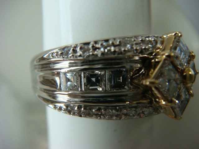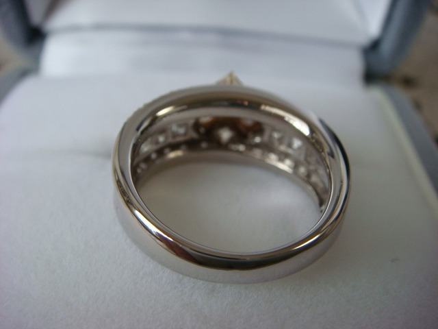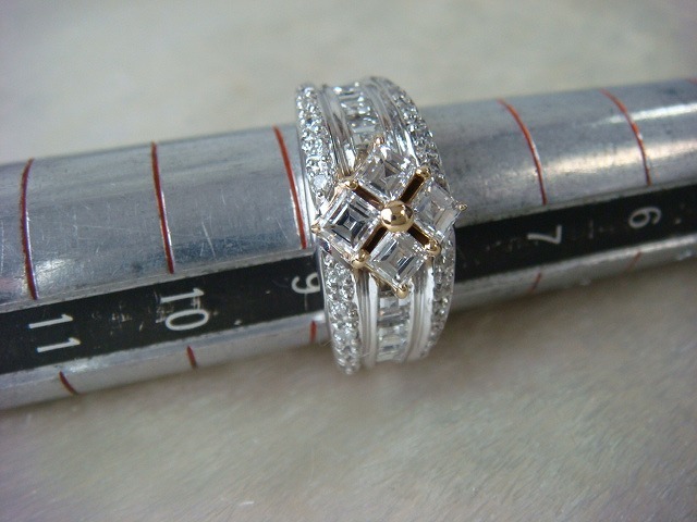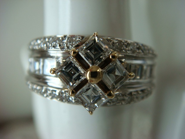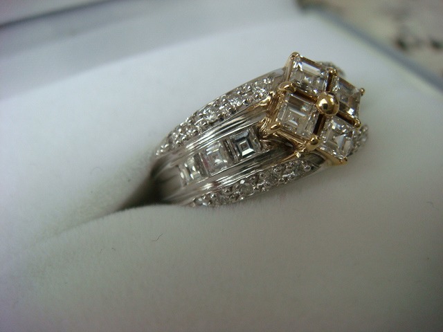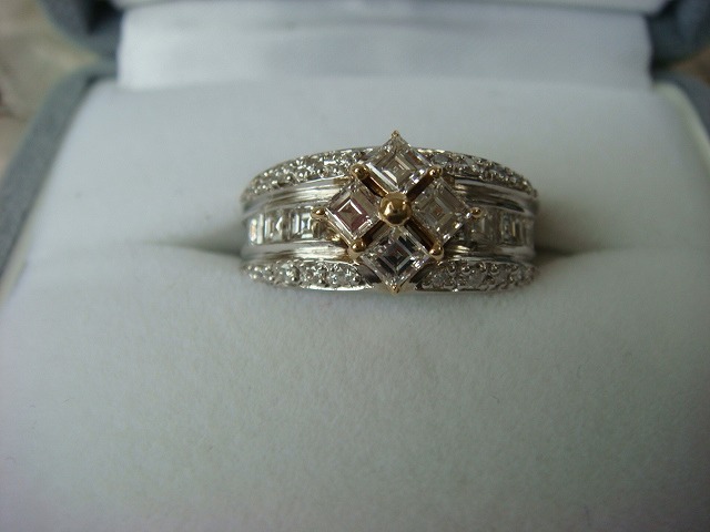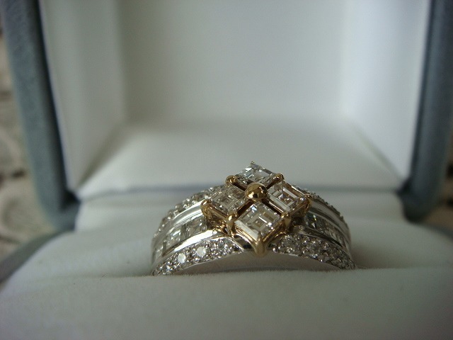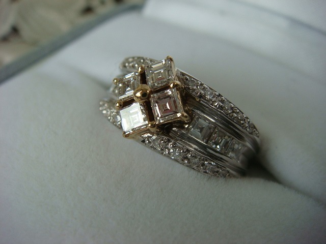 エメラルドカットの4つのダイヤとメレダイヤの合計は1.04カラットです。爪の部分は18金です。
