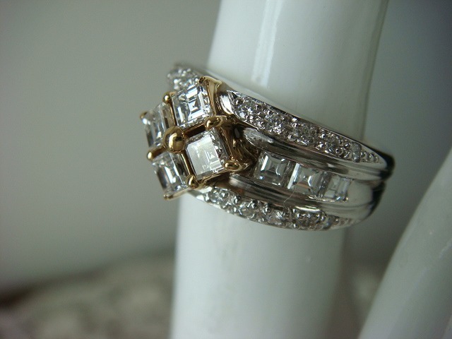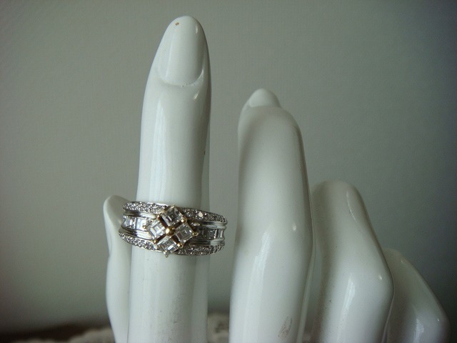 エメラルドカットのダイヤを使ったリングです。サイズは約8,5です。プラチナ製 PT900の刻印入り。