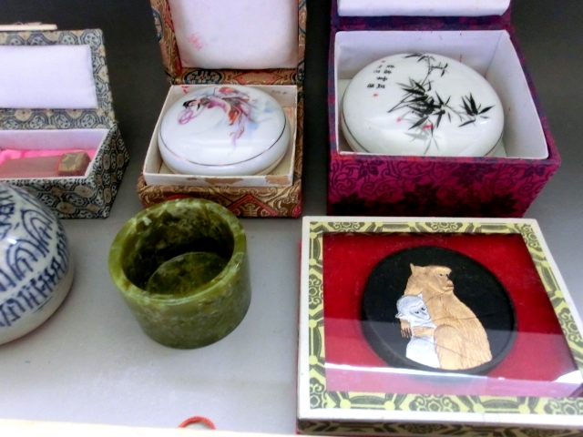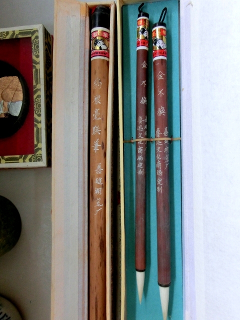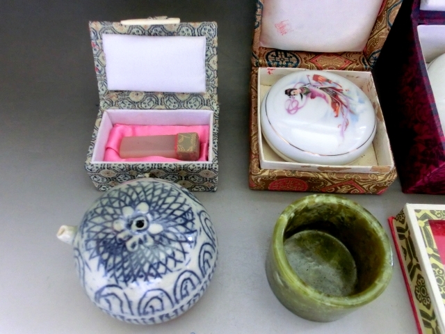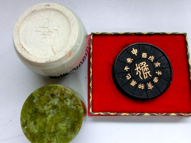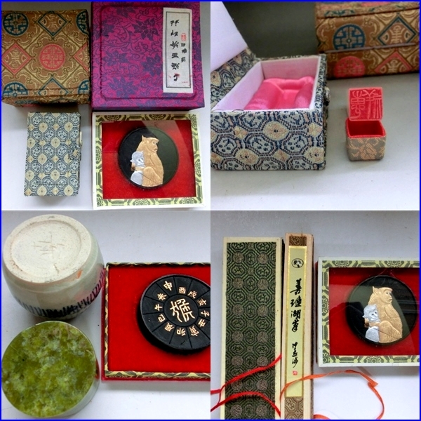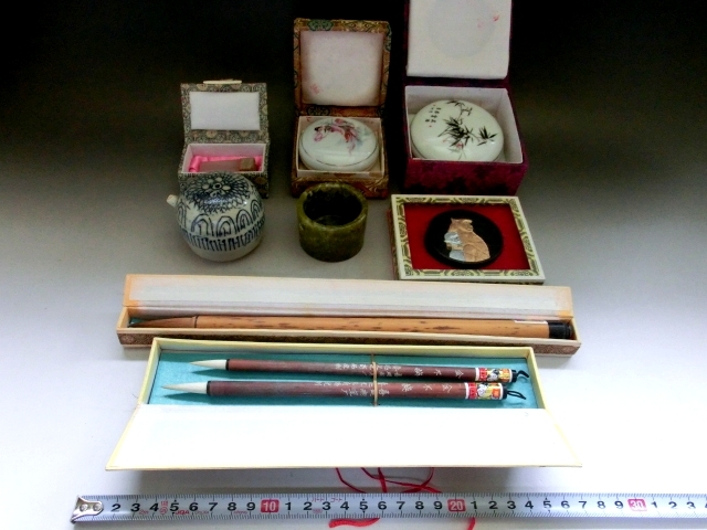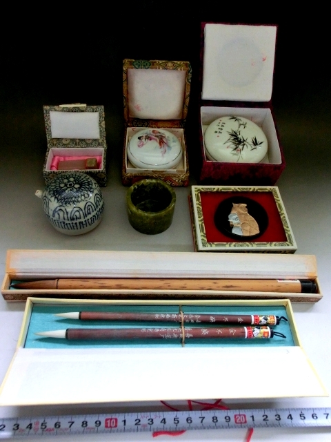 書道道具■染付水滴 印材 筆洗い 朱肉 墨 筆 8点セット 古民具 古美術 時代物 骨董品■