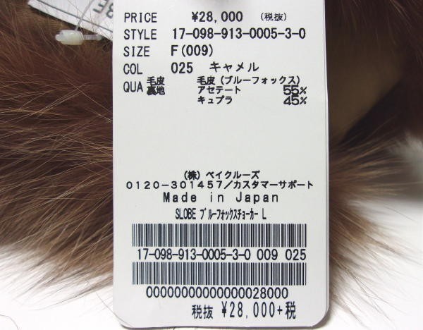 ◆SLOBE IENAのブルーフォックスティペット新品です。 ブルーフォックスを使用したファーティペット。 ほどよいボリューム感で、取り入れるだけで華やかな雰囲気に。 クリップで簡単に留めていただける仕様で、使いやすいところも嬉しいポイント。 定価は¥28.000+税です。 実寸サイズ 86cm×16cm ※採寸は参考程度とさせていただきます。 カラー ブラウン系 素材 ・毛皮:ブルーフォックス ・裏地 アセテート:55% キュプラ:45% |
